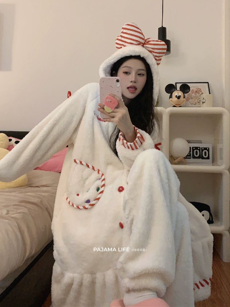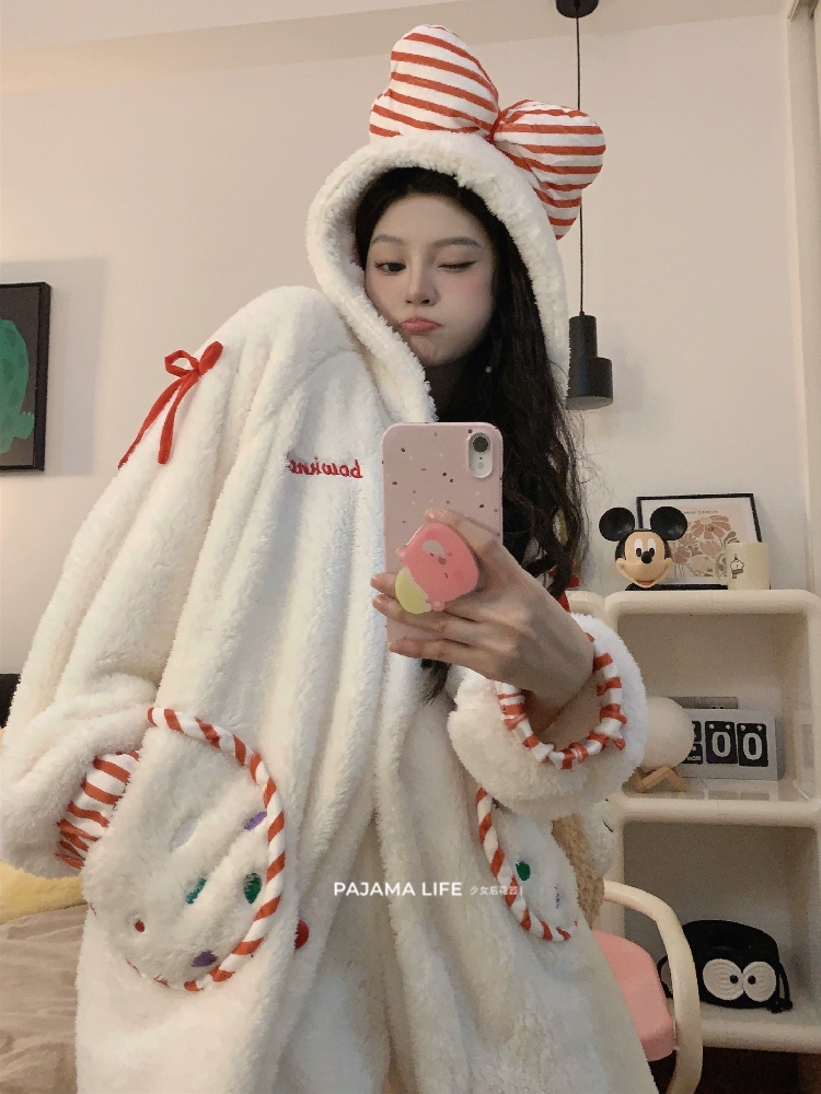 | nameOriginal | Korean style "Bowknot" hooded coral velvet pajamas for women winter new plus velvet thickened pajamas set home wear |