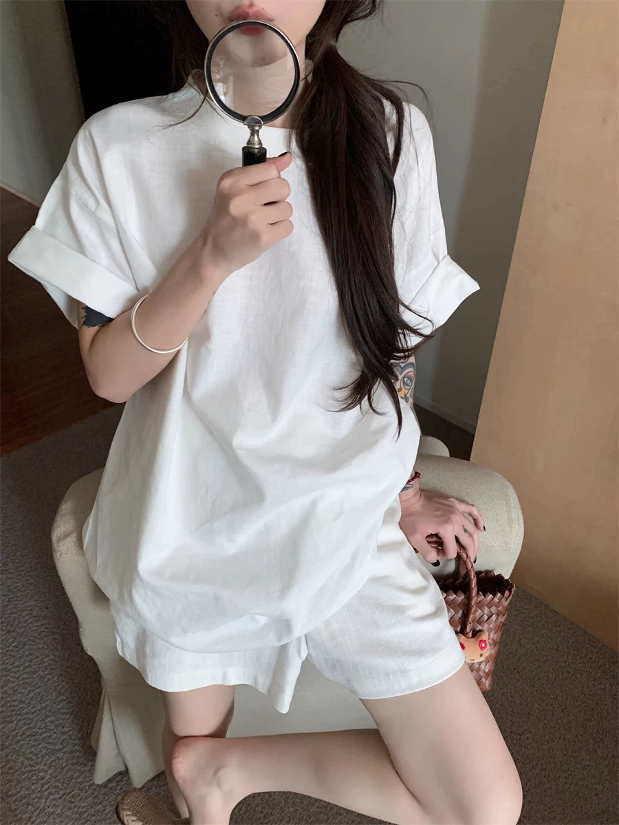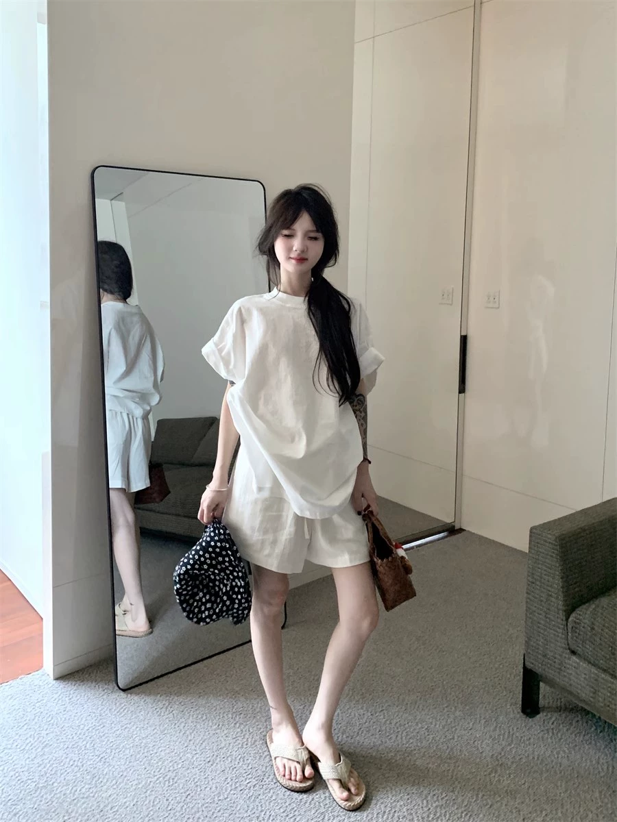 | nameOriginal | Korean style casual sports suit for women summer 2024 new white round neck short-sleeved tops wide-leg shorts two-piece set |