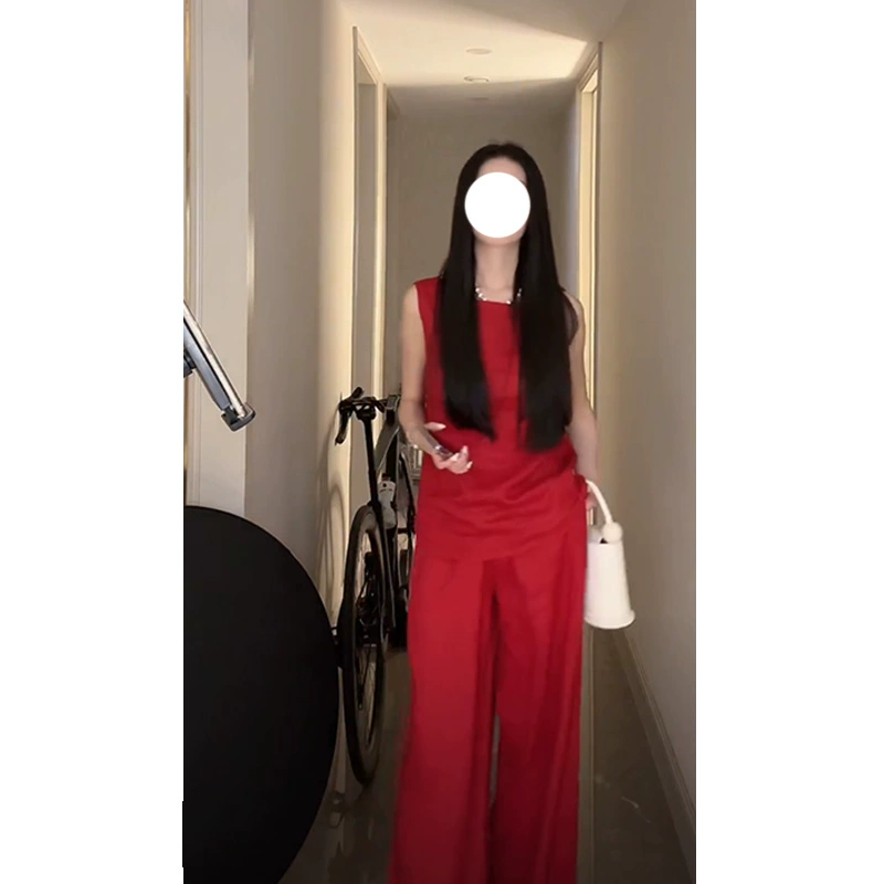 Korean style casual wide leg trousers red two piece top