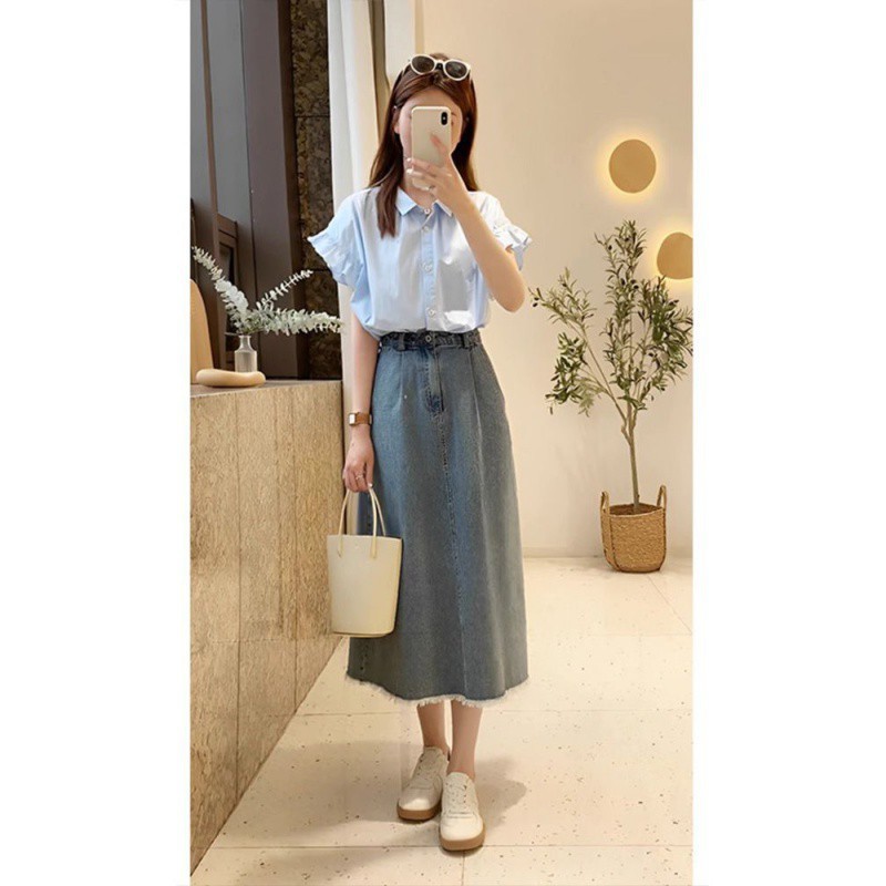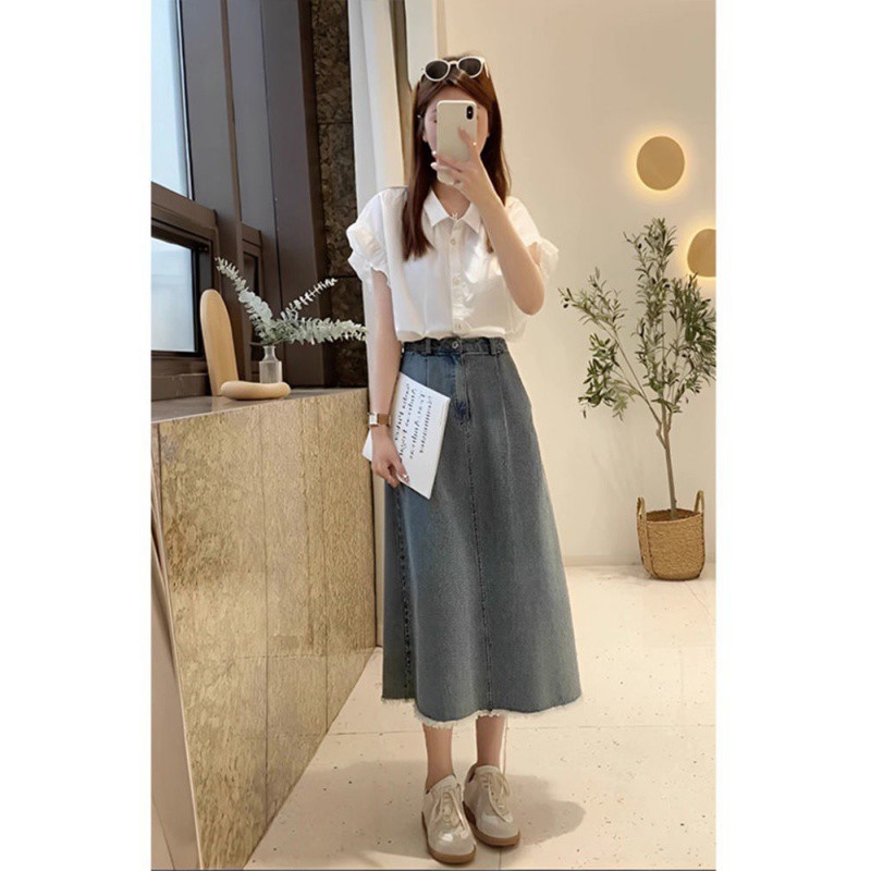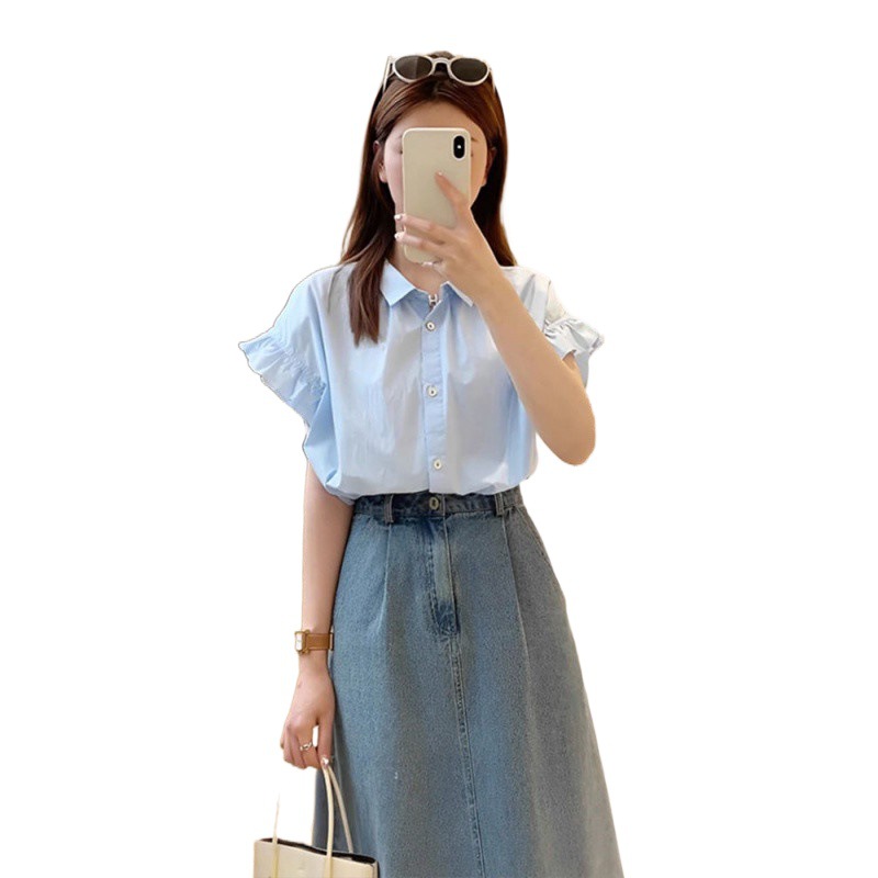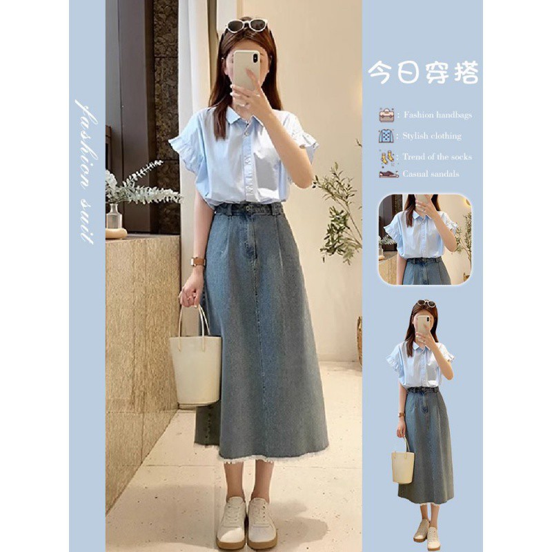 Korean Style Chic Design Sense Niche French Retro Short-sleeved Shirt Denim A- line Skirt High Waist Skirt Two-piece Set