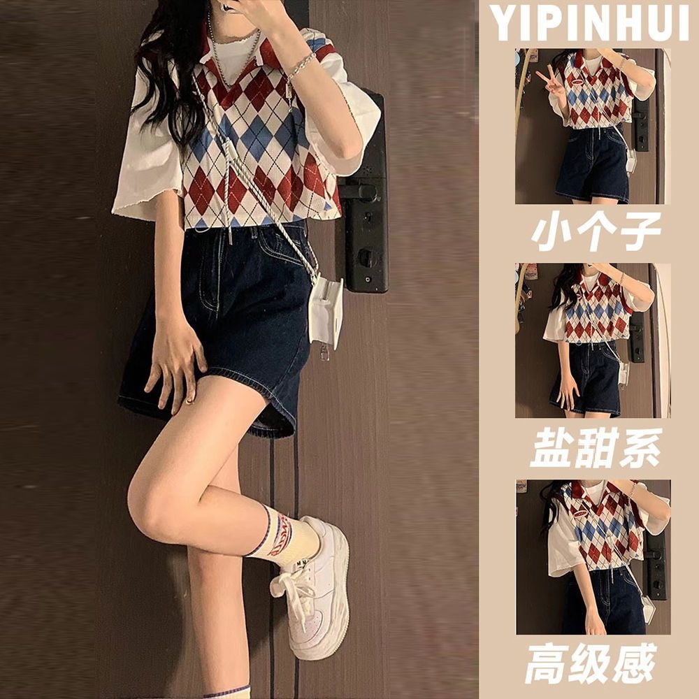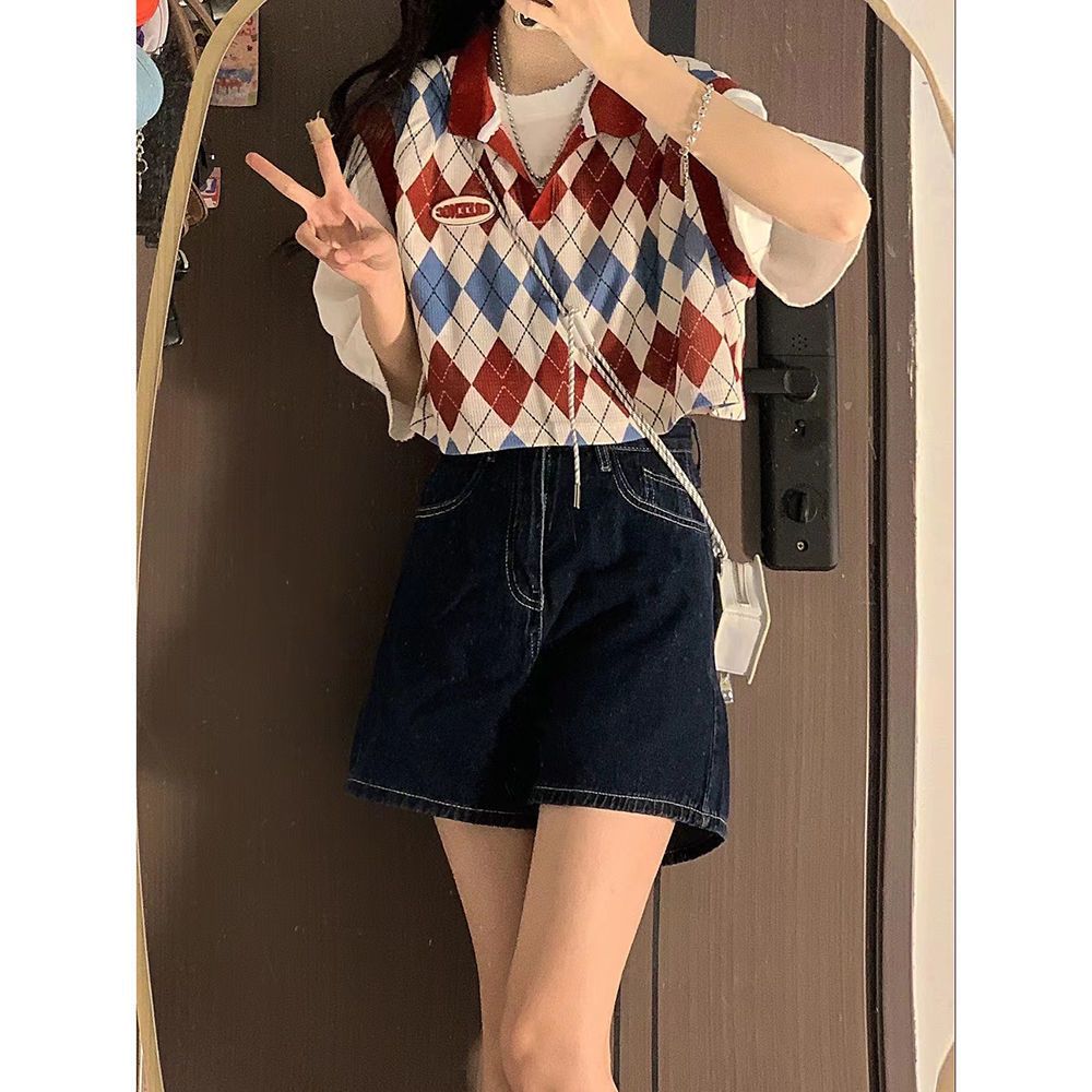 | nameOriginal | Korean Style College Style Women's French Style High-end Hong Kong Style Vest Shirt Denim Shorts Trendy Three-piece Set |