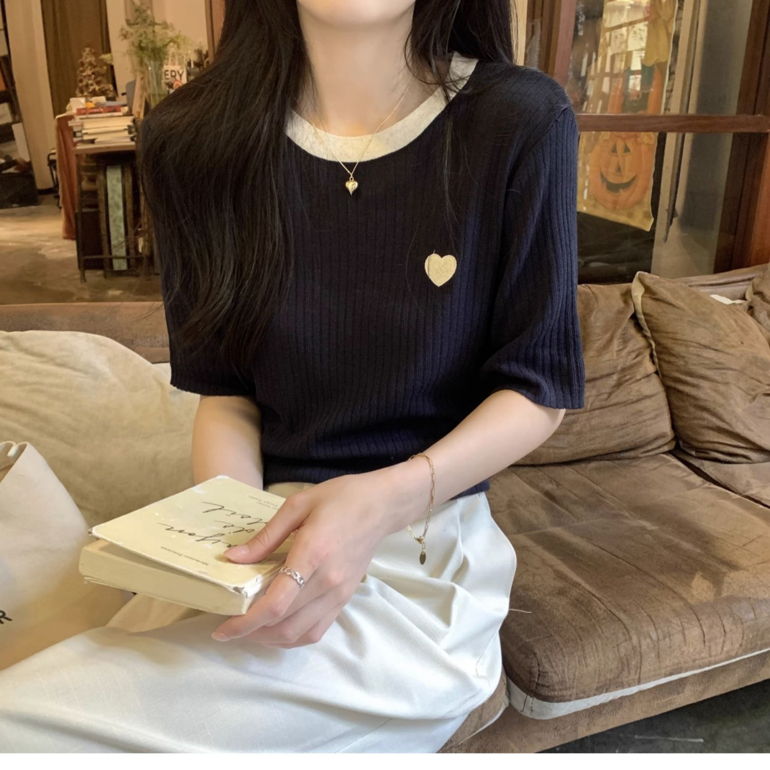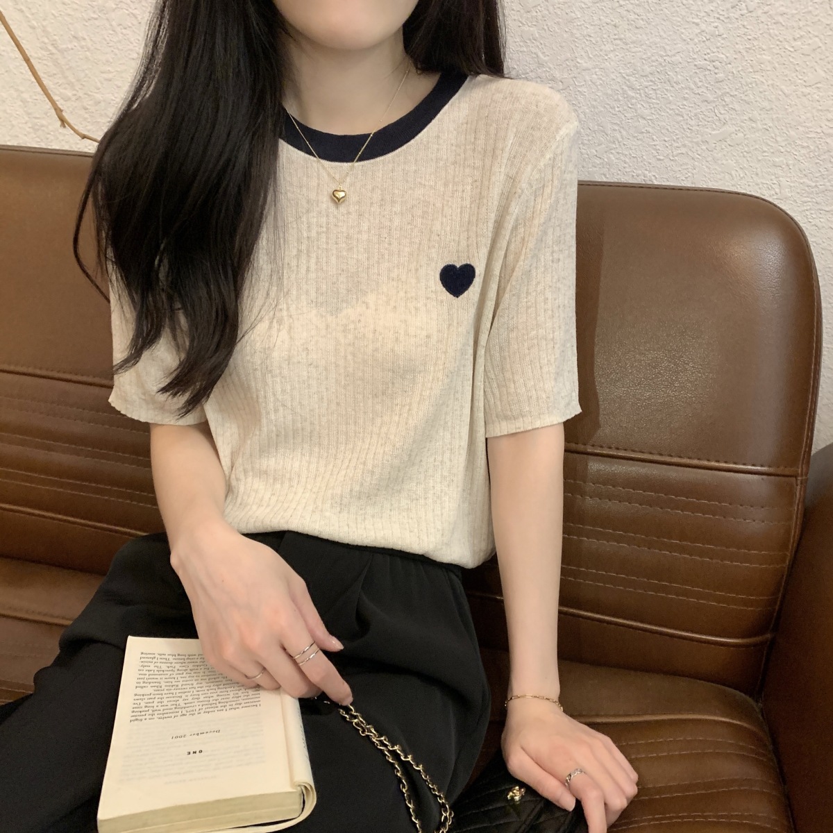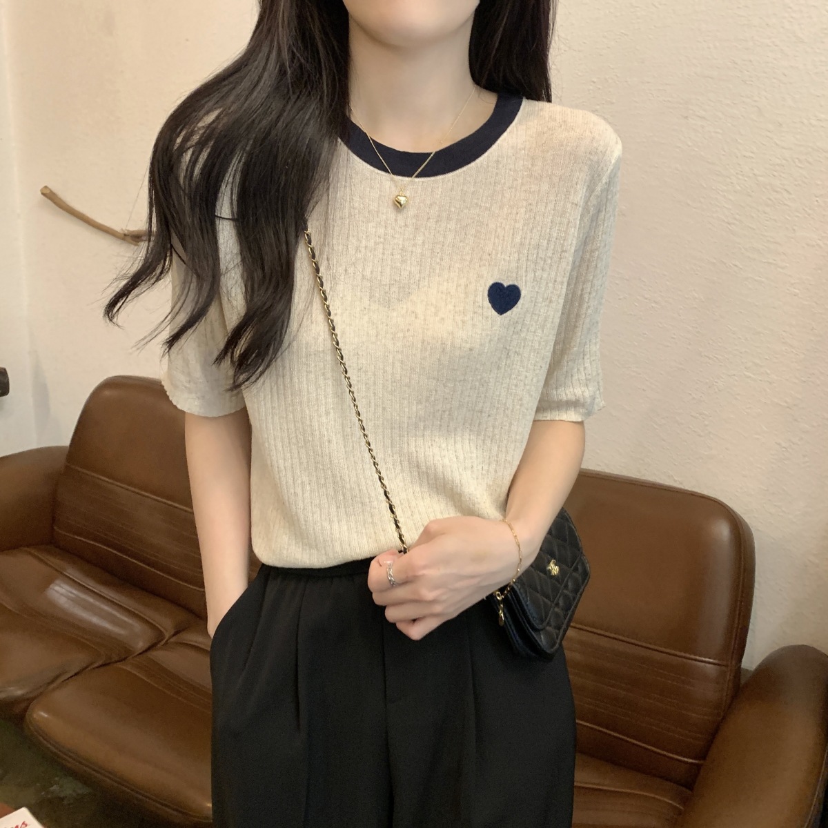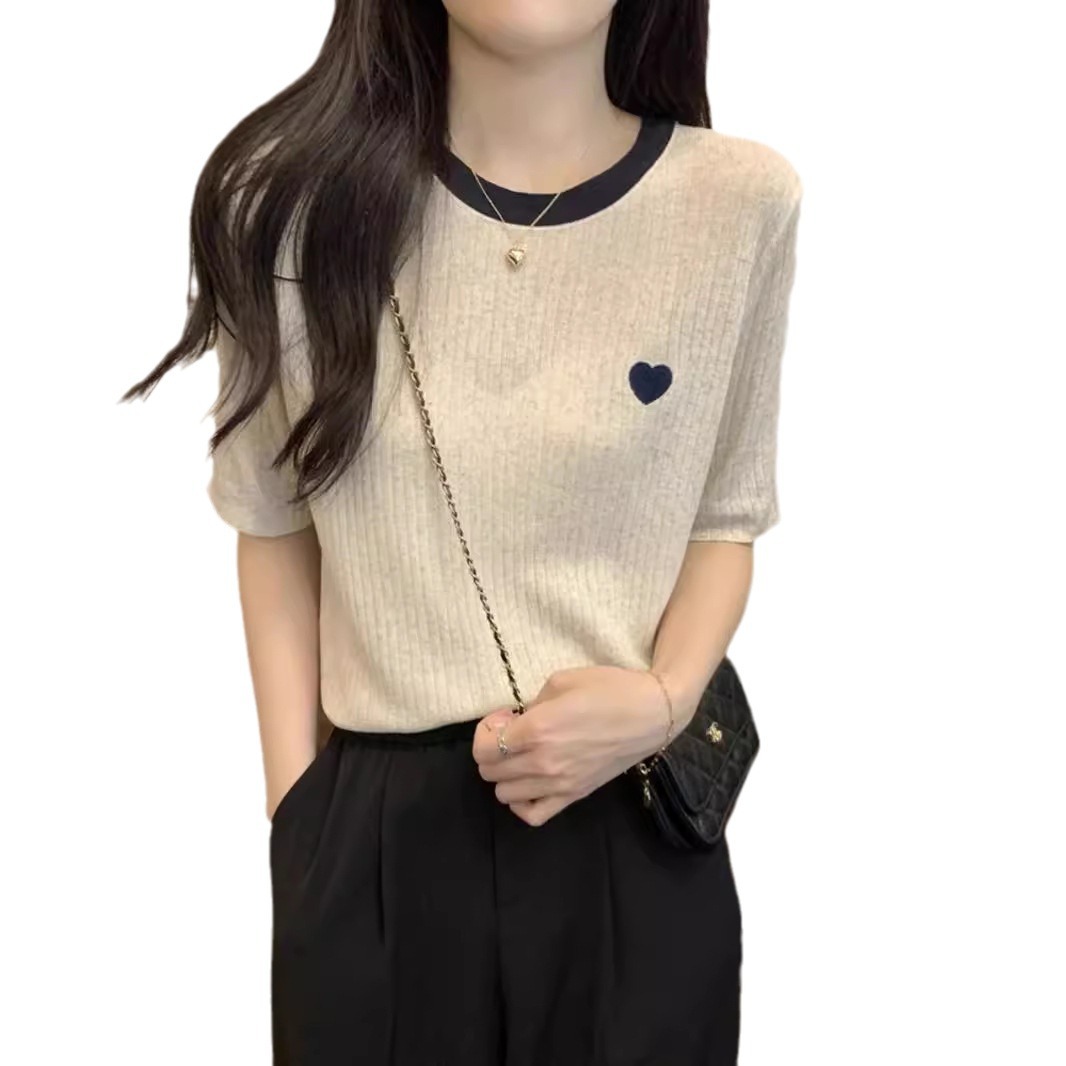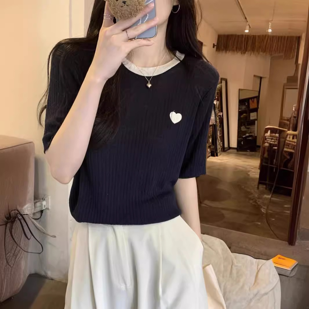 | nameOriginal | Korean Style Contrast Color Design Crewneck T-shirt Summer 2024 New All-match Pit-strip Love Knitted Short-sleeved Women's Top |