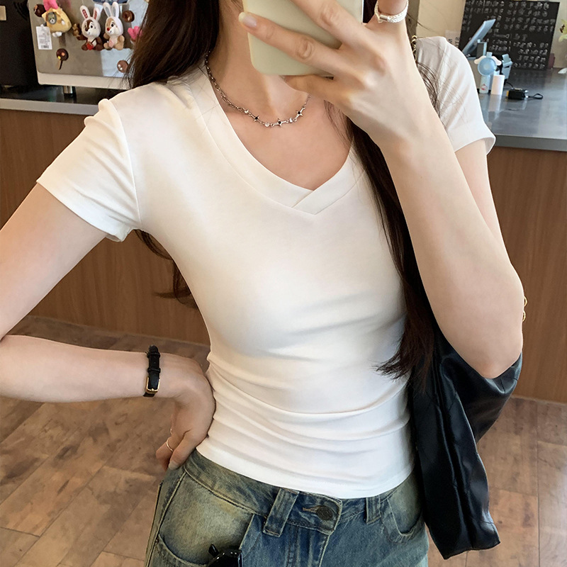 Korean Style Cool Sense Dopamine Slim-fit V-neck Short-sleeved T-shirt Women's Summer 2024 New Slimming Spice Girl Top