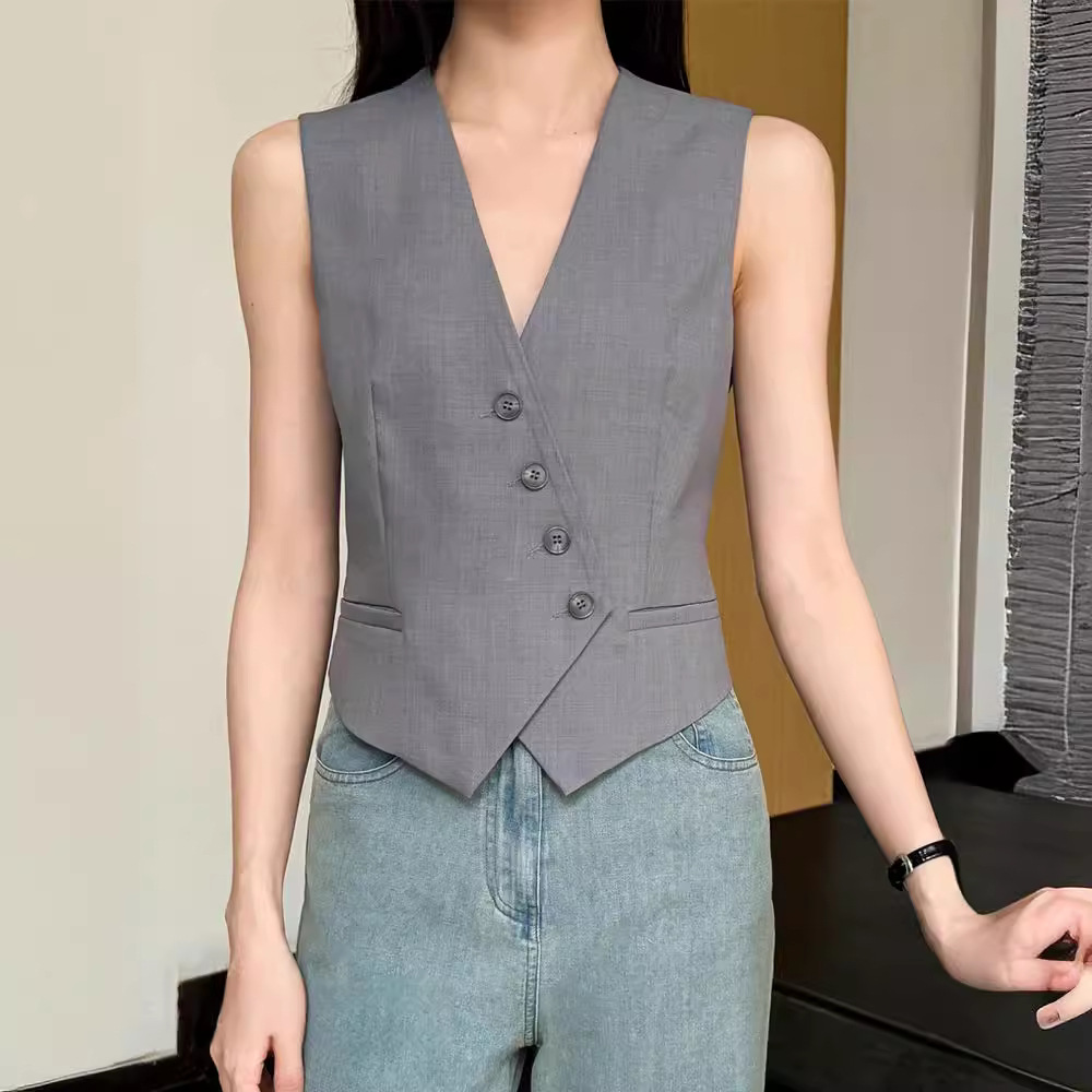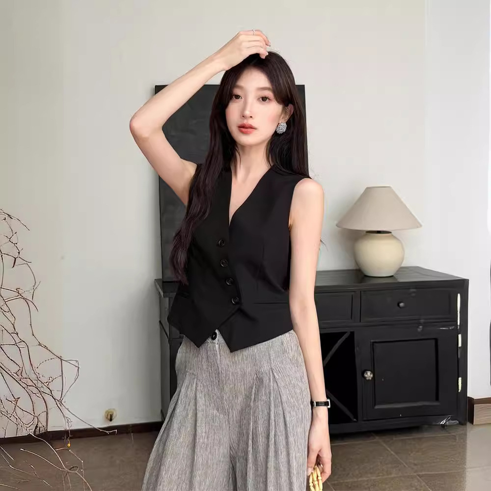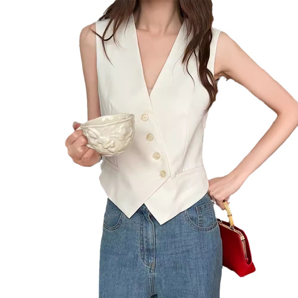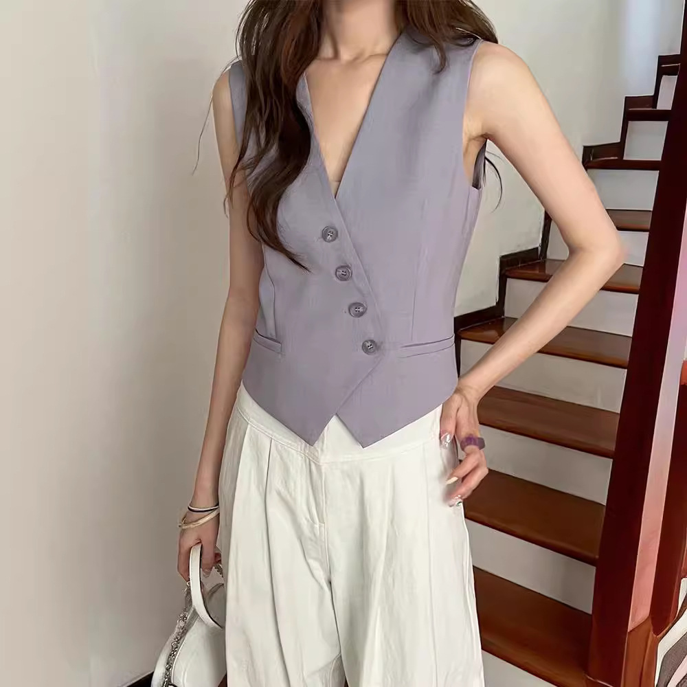 Korean Style Design Sense V-neck Inclined Button Sleeveless Suit Vest Women’s 2024 Summer Elegant Short All-match Top
