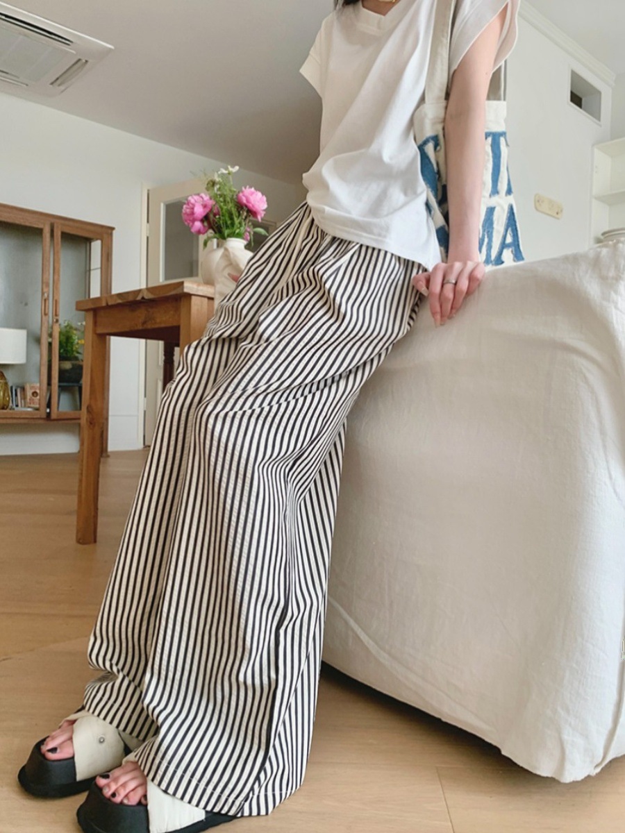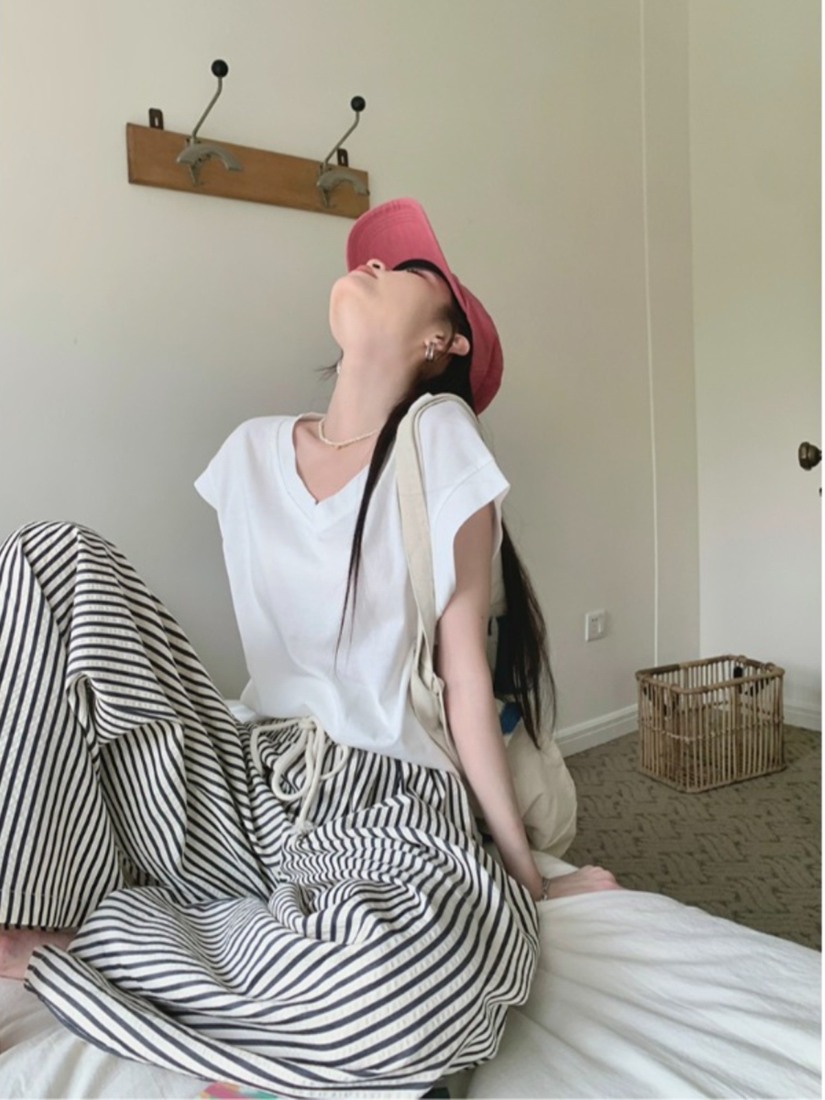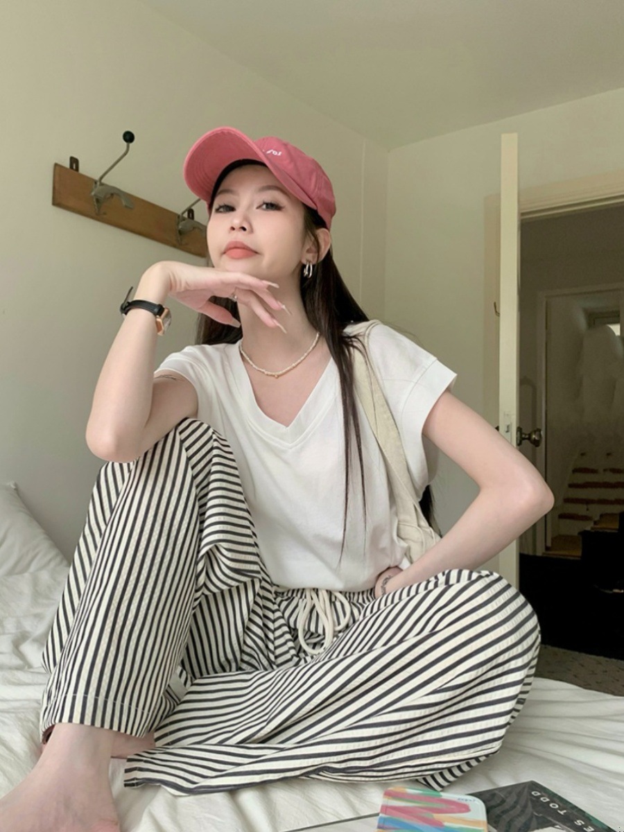 | nameOriginal | Korean Style Elegant Casual Suit Women's Summer 2024 New V-Neck T-Shirt Top Striped Casual Pants Western Style Two-Piece Suit |