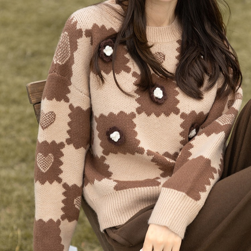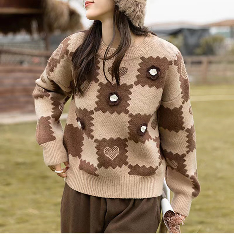 | nameOriginal | Korean Style Flower Contrast Color Love Knitted Sweater Women's 2023 Autumn and Winter New Lazy Style Loose Chessboard Plaid Pullover |
