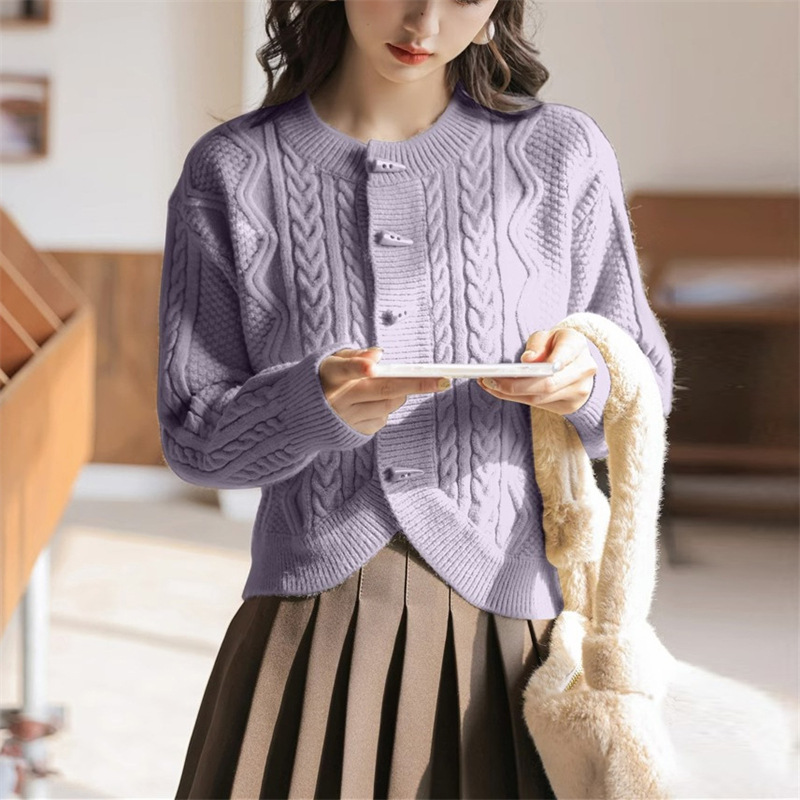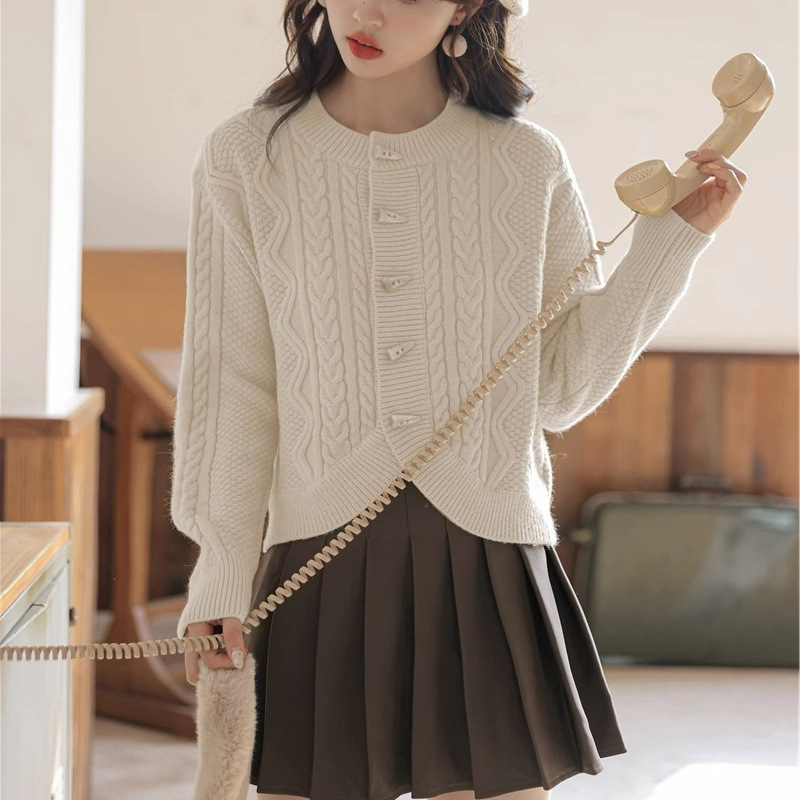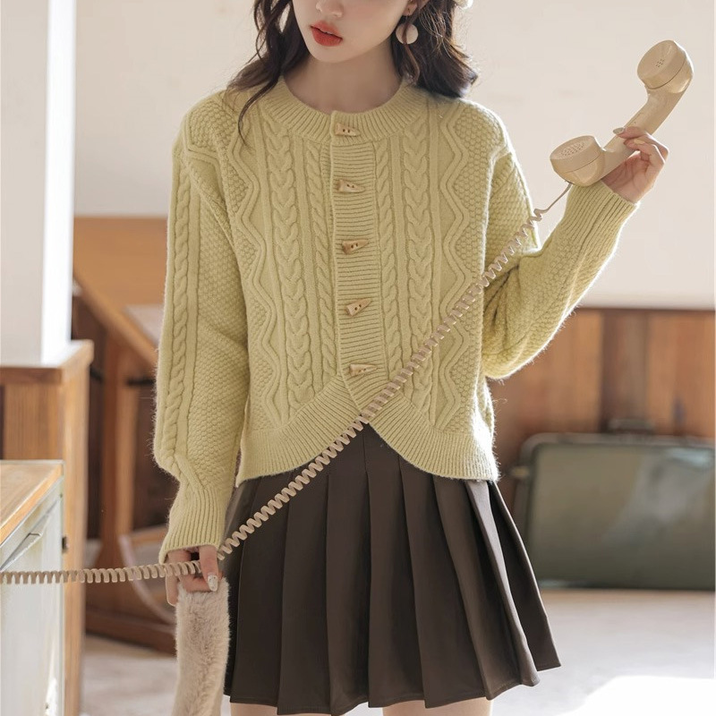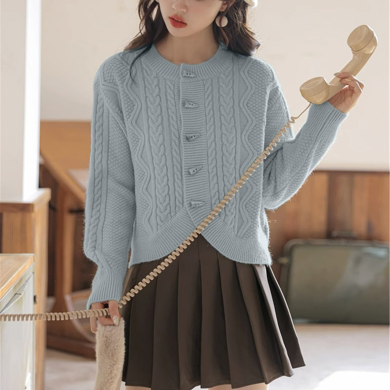 | nameOriginal | Korean style fresh horn buckle twist knitted cardigan women's autumn new round neck short long sleeve sweater women's top |