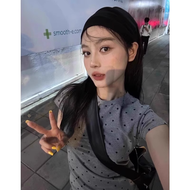 Korean Style Grey Wave Dot Positive Shoulder Short-sleeved T-shirt Women’s Summer 2024 Hot Girls Slim-fit Slimming Short Top Hair