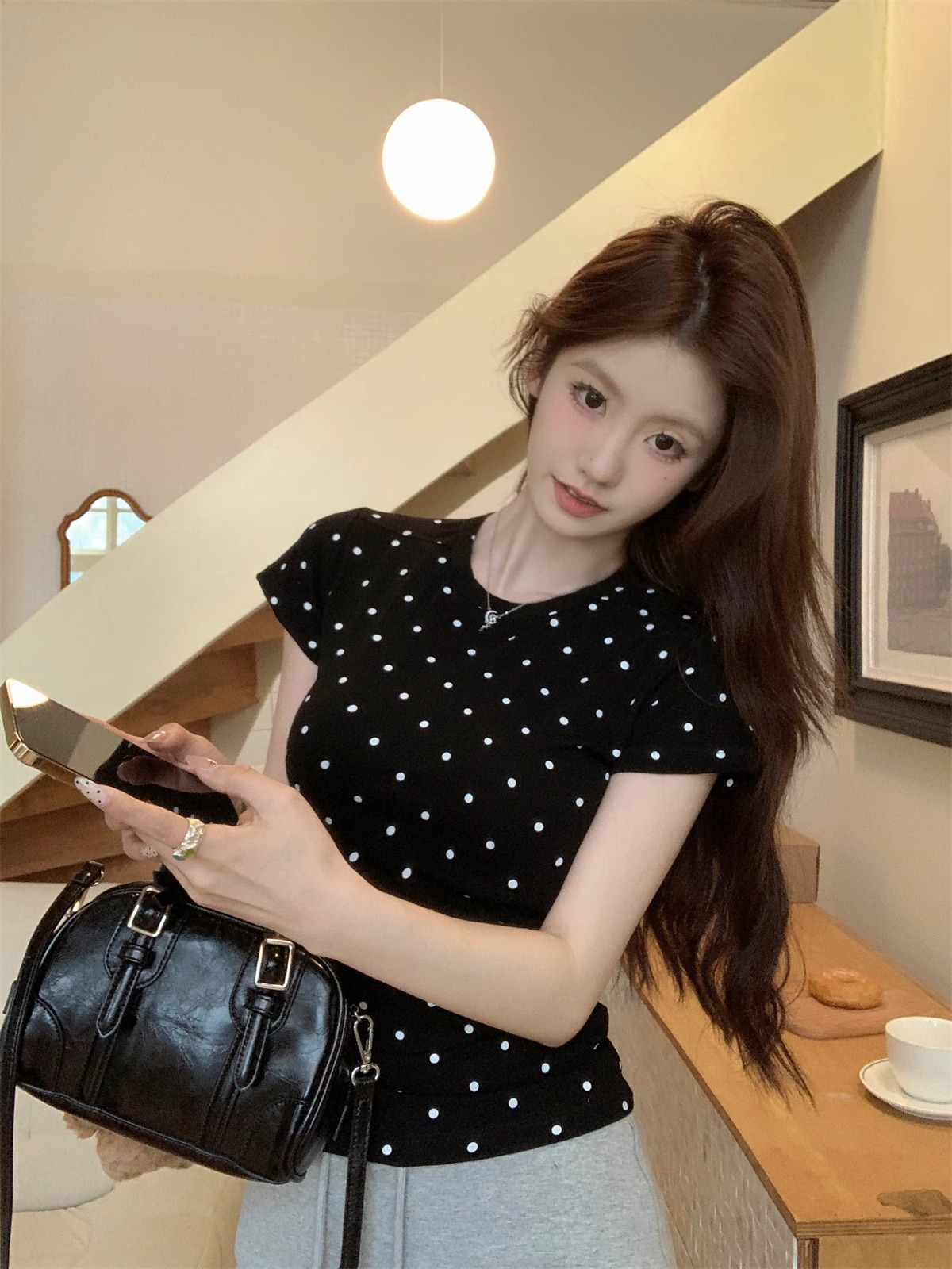 Korean Style Grey Wave Dot Positive Shoulder Short-sleeved T-shirt Women's Summer 2024 Hot Girls Slim-fit Slimming Short Top Hair