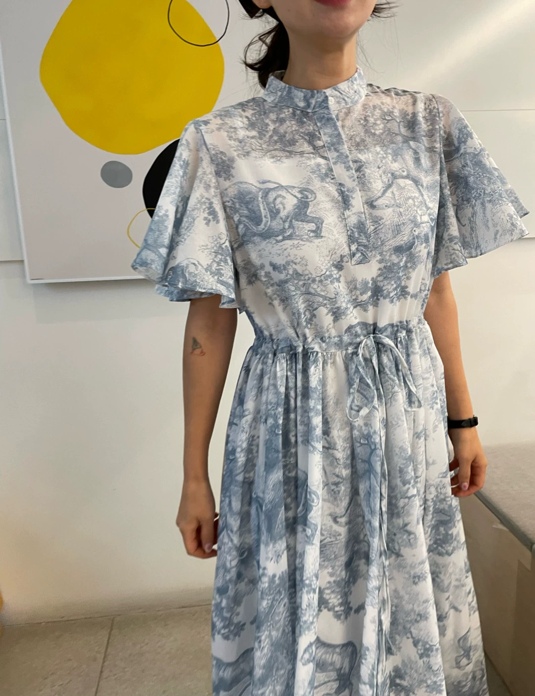 Korean style ins retro stand-up collar ink smudged drawstring tie flying sleeve chiffon dress 2024 summer long skirt