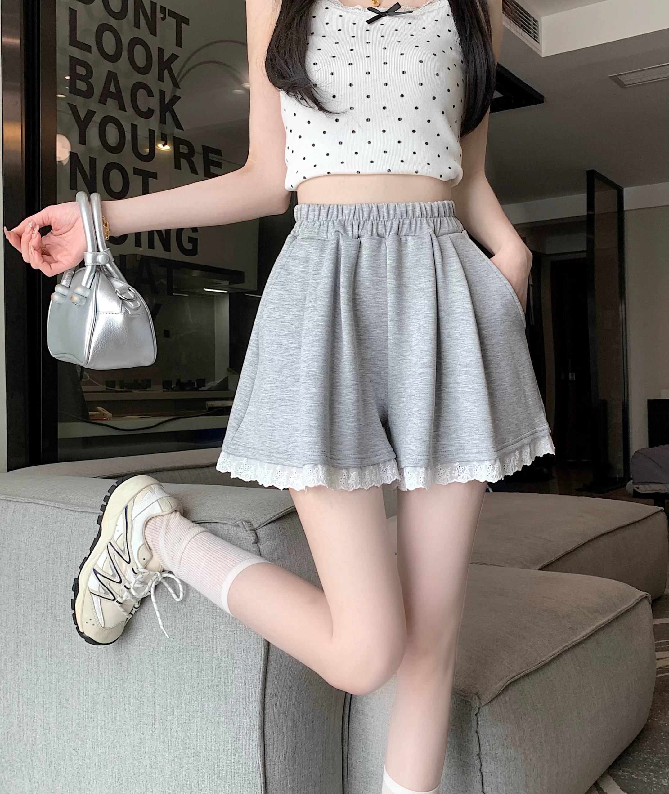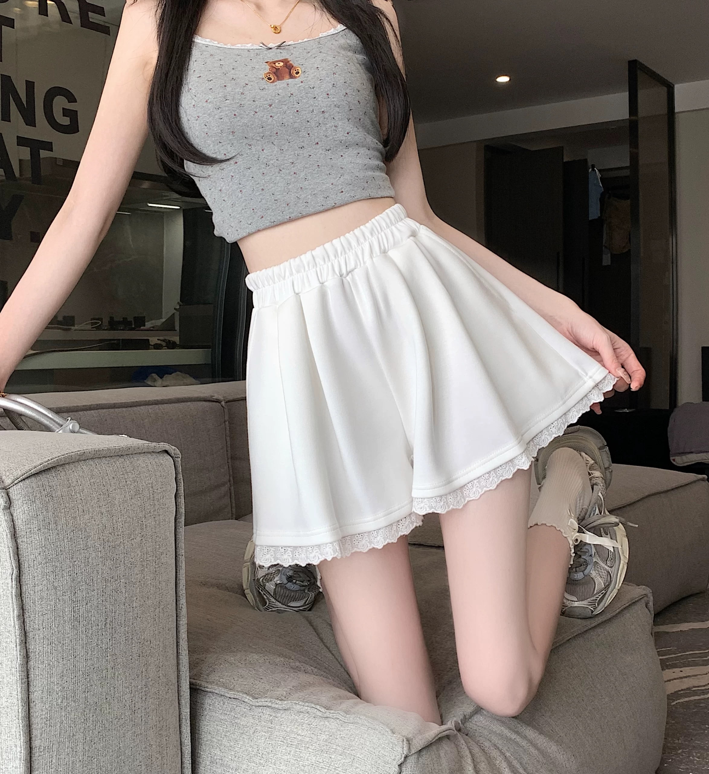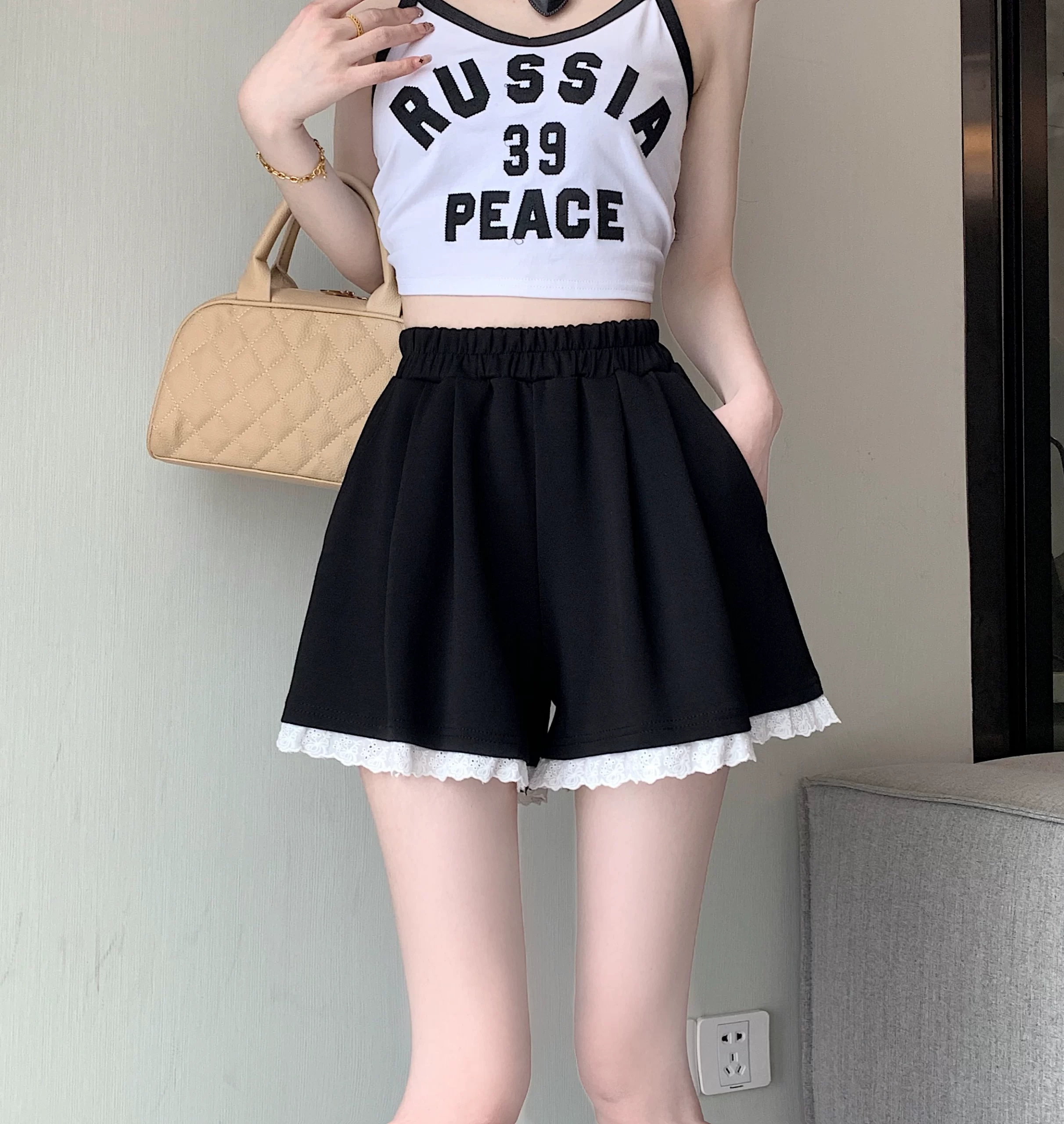 | nameOriginal | Korean style lace spliced casual pants for women summer 2024 new elastic high waist temperament versatile wide leg shorts |