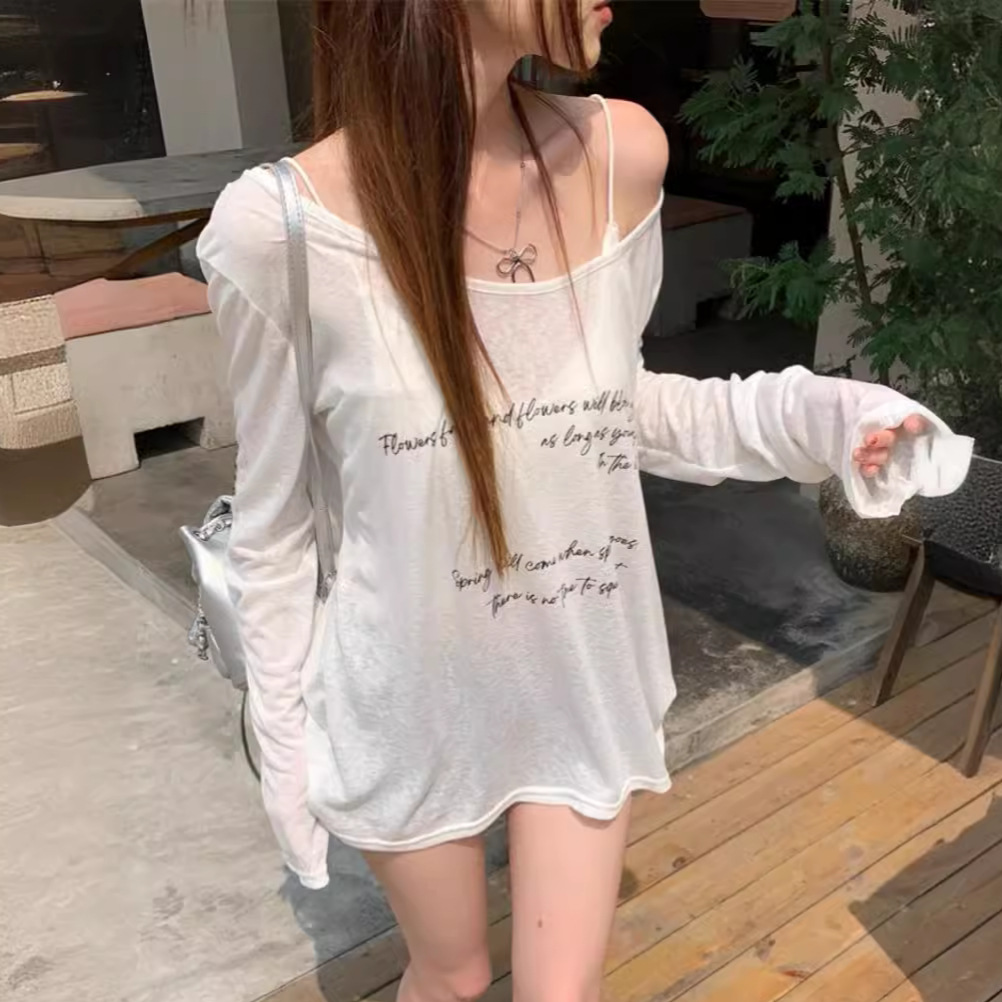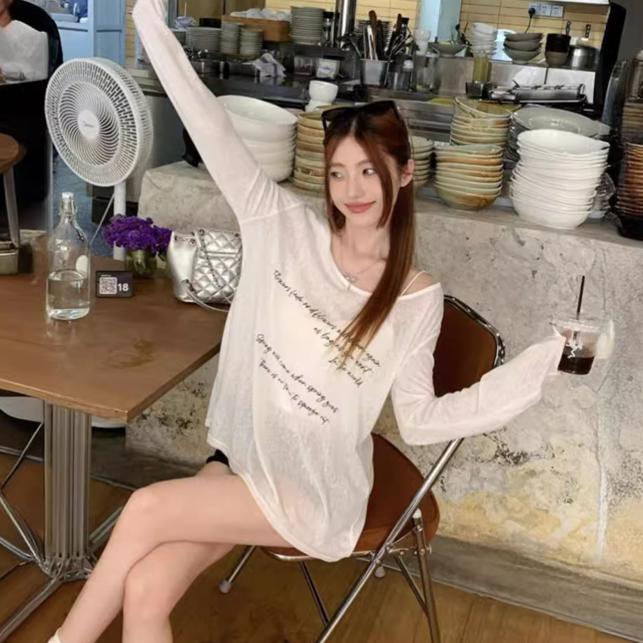 | nameOriginal | Korean Style Laid-back Style White Letter Long-sleeved T-shirt Women's Summer Off-shoulder Loose Thin Sunscreen Blouse Casual Top |