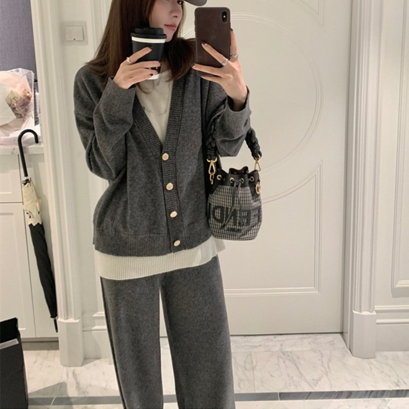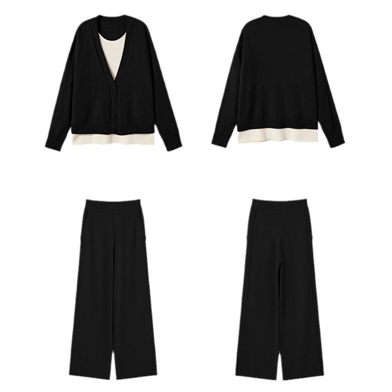 Korean Style Lazy Style Fake Two-piece Soft Waxy Knitted Sweater Suit Women's Spring and Autumn Loose Split Wide Leg Pants Sweater Coat