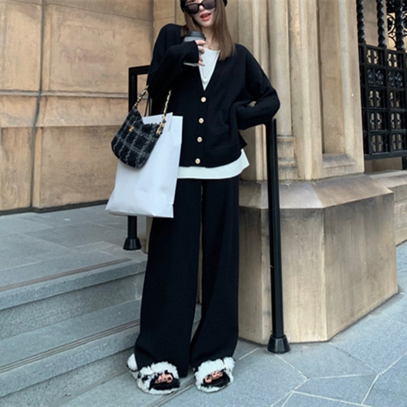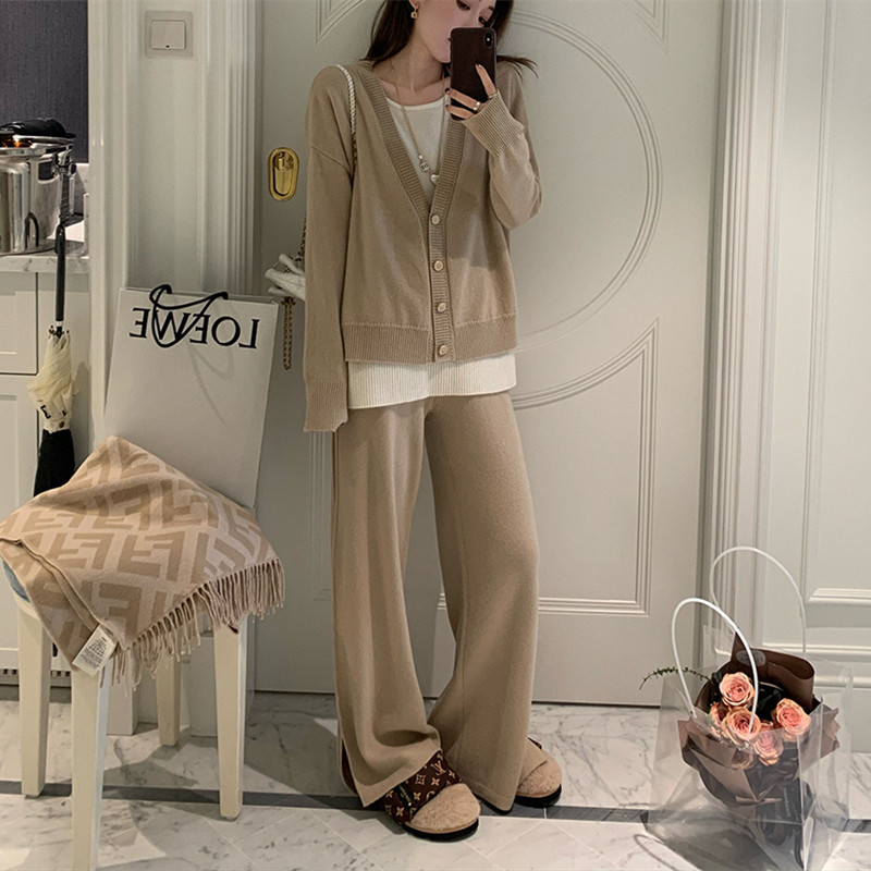 Korean Style Lazy Style Fake Two-piece Soft Waxy Knitted Sweater Suit Women’s Spring and Autumn Loose Split Wide Leg Pants Sweater Coat