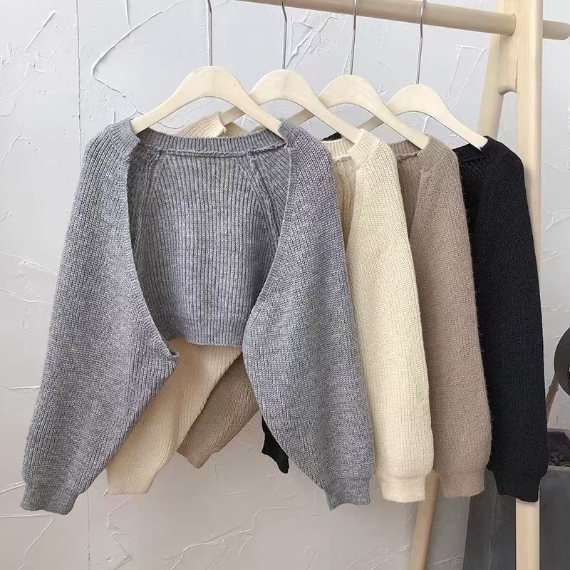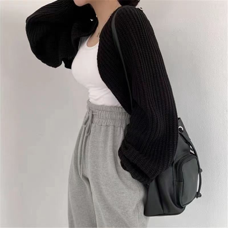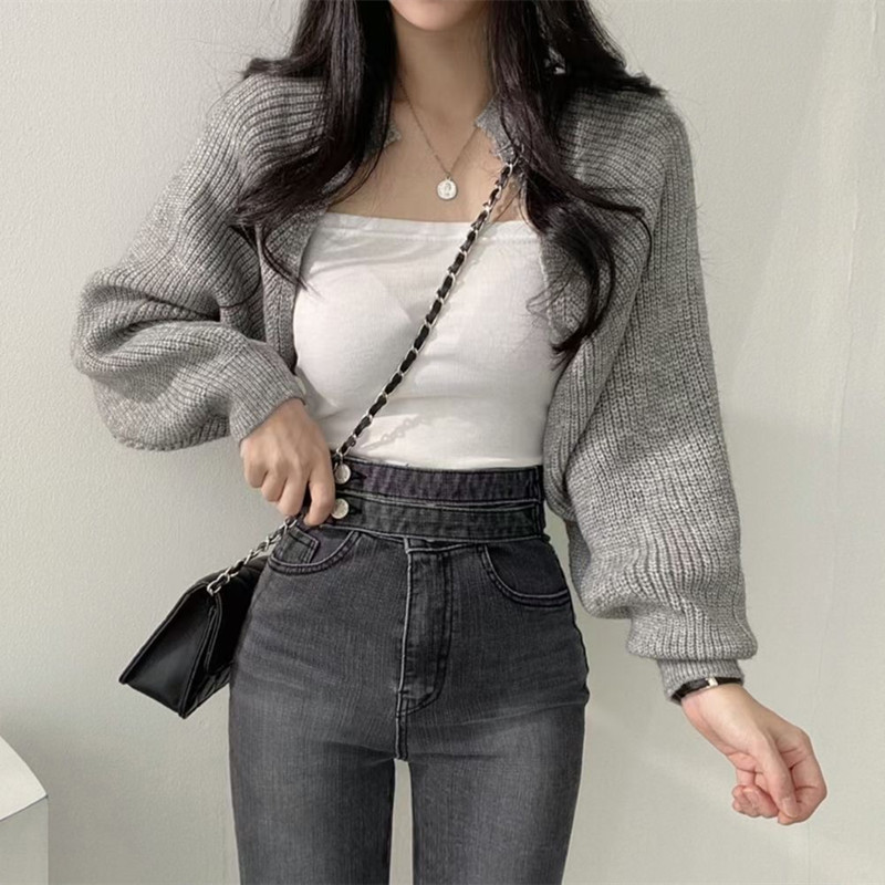 Korean Style Lazy Style Knitwear Shawl Women’s 2024 New Autumn Solid Color Lantern Sleeve Short Coat Top 3430