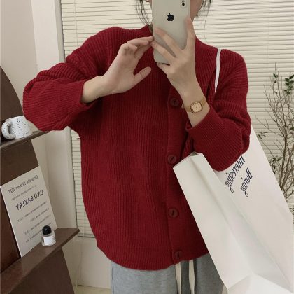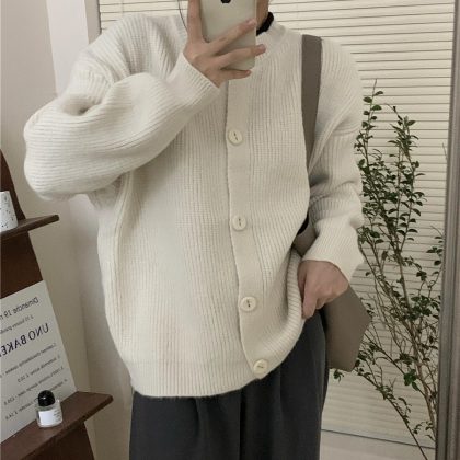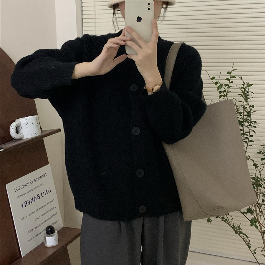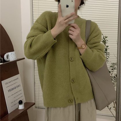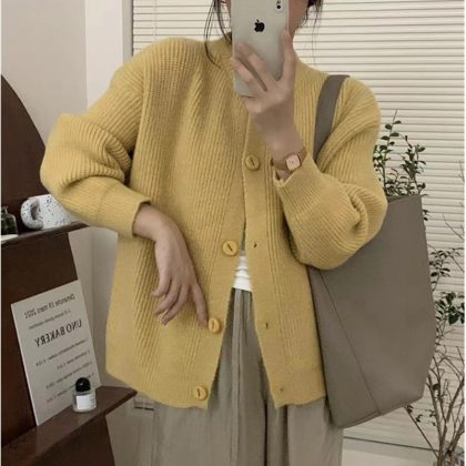 Korean Style Lazy Style Round Neck Solid Color Knitted Cardigan Top Women’s Autumn and Winter New Retro Soft Waxy Loose Sweater Jacket