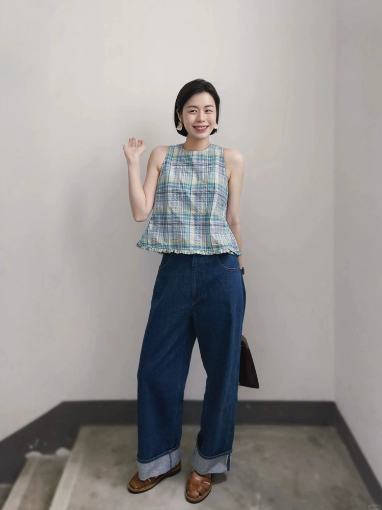 Korean style plaid vest, fresh and chic, sleeveless lace