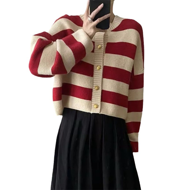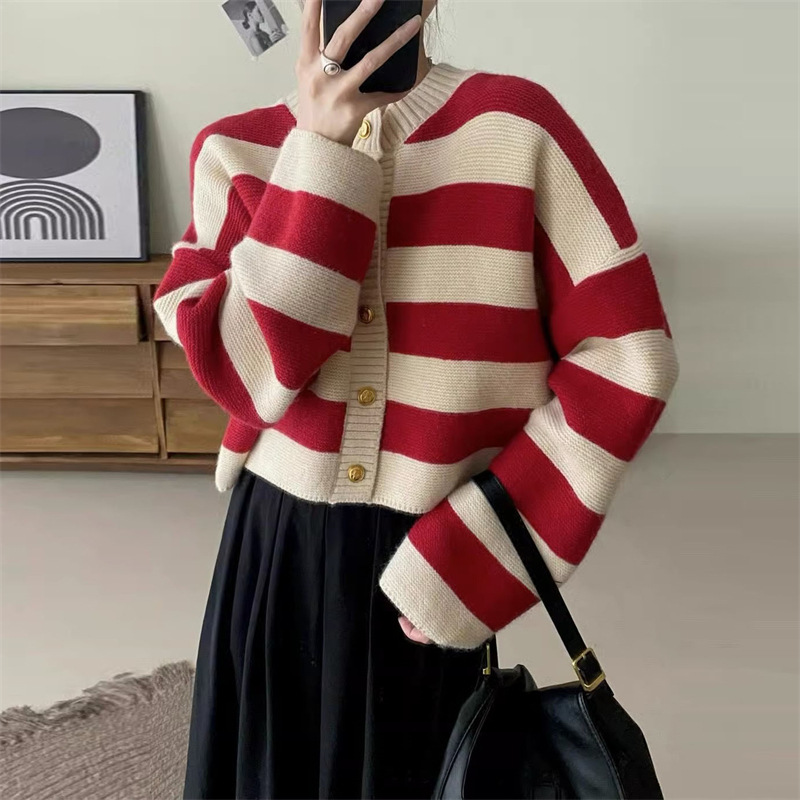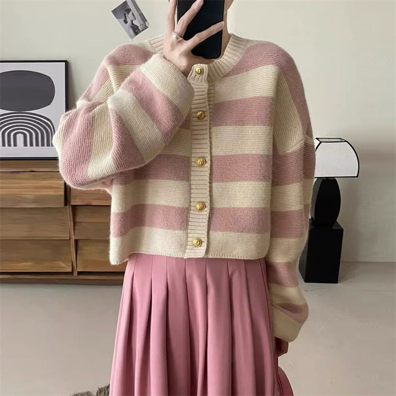 | nameOriginal | Korean style round neck contrast color striped knitted cardigan women's autumn 2023 new western style loose slimming long sleeve top |