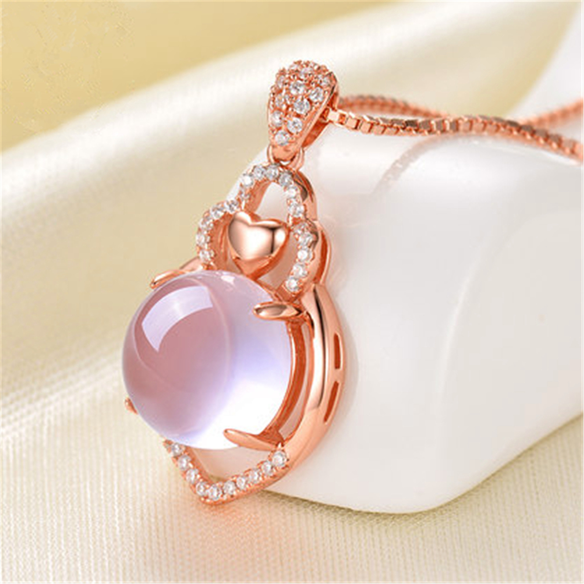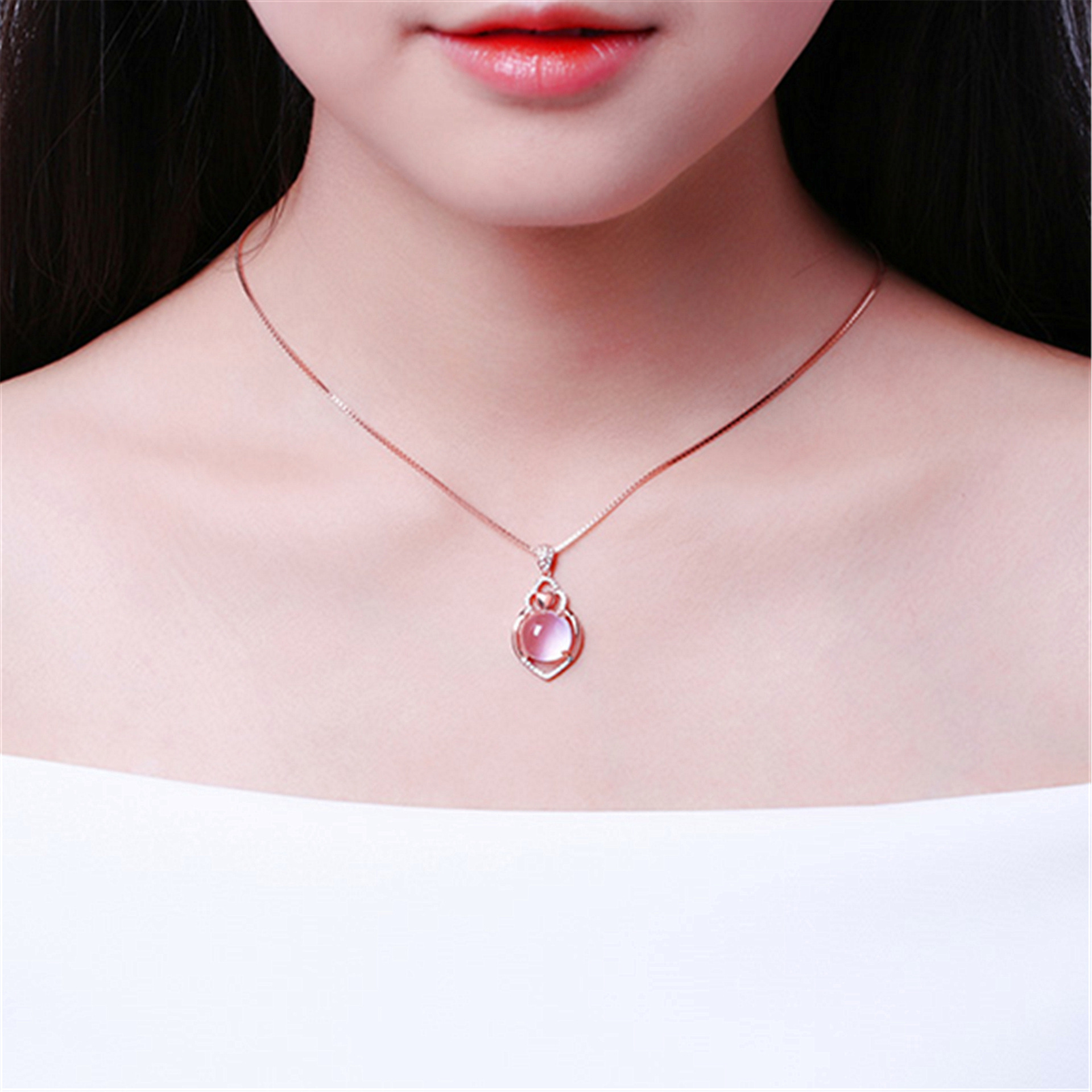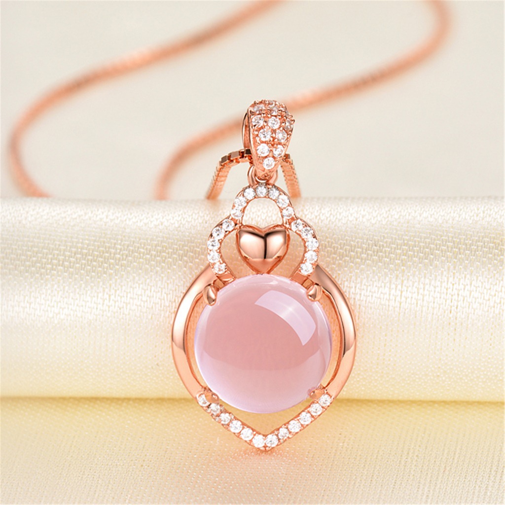 Korean Style Silver Rose Gold Necklace Women's Natural Pink Crystal Love Shape Hibiscus Stone Pendant Collarbone Chain Gem Silver Jewelry