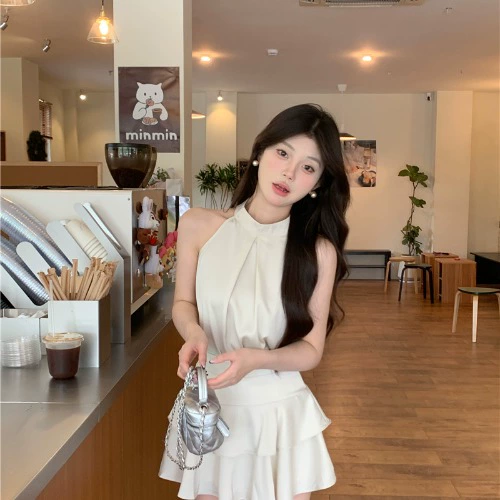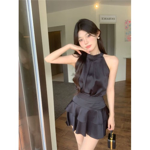 Korean version of sleeveless ruffled skirt high waist fashion satin