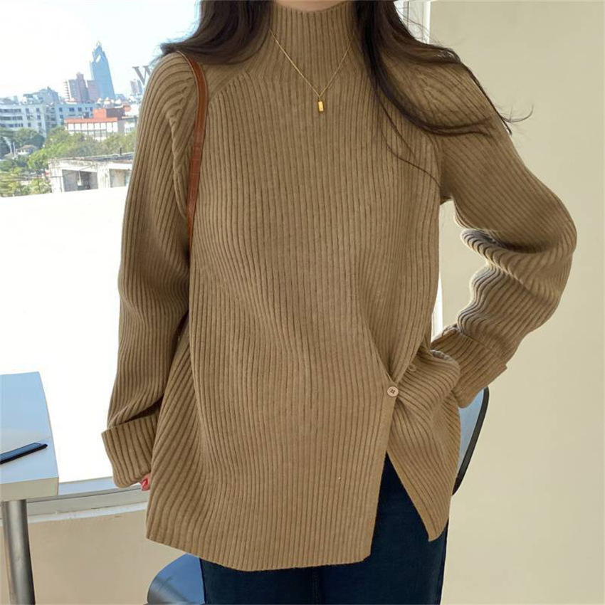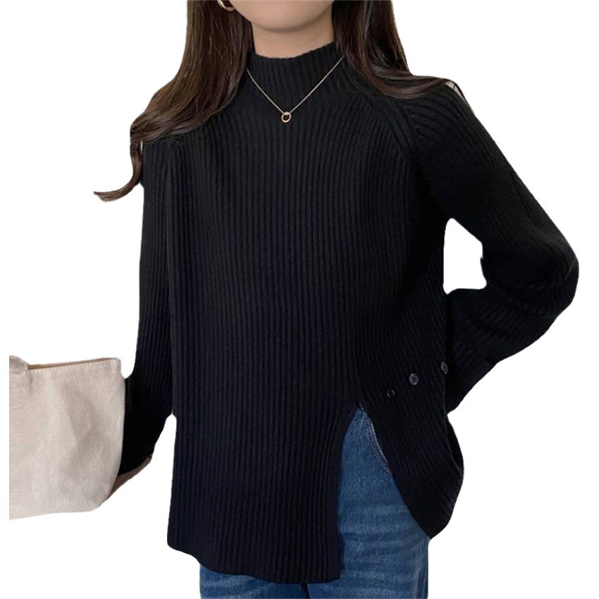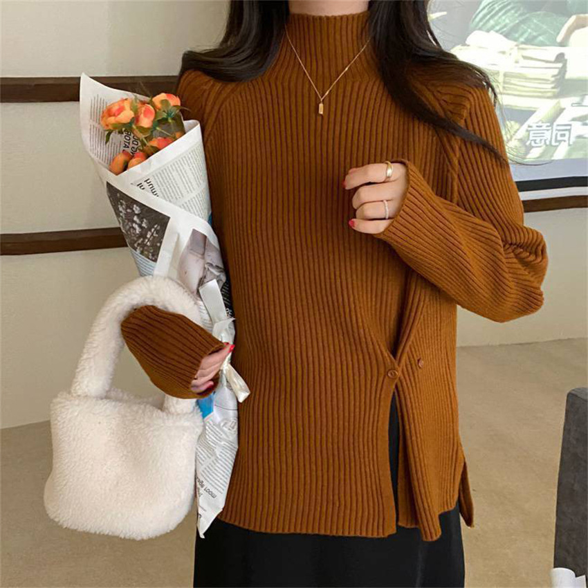 Korean style solid color half turtleneck knitted pullover women's autumn and winter New button split pit striped bottoming shirt 1236