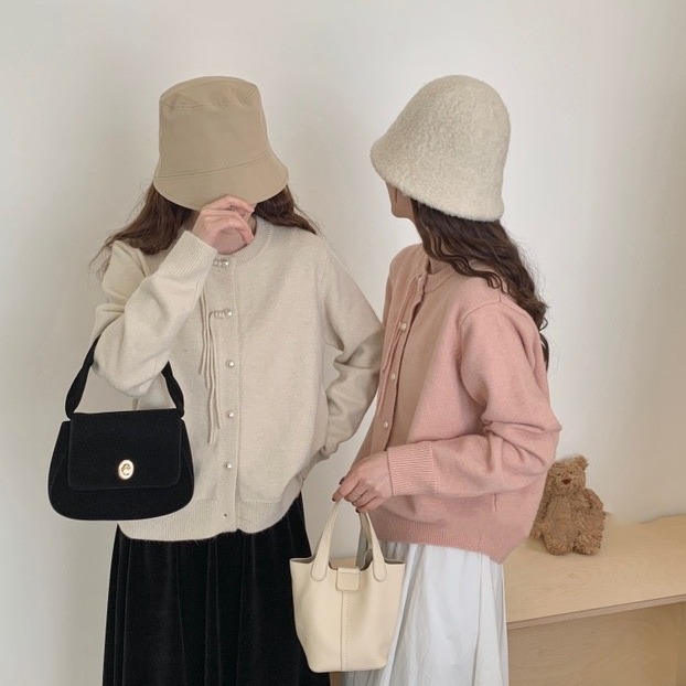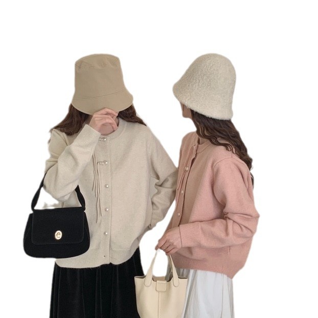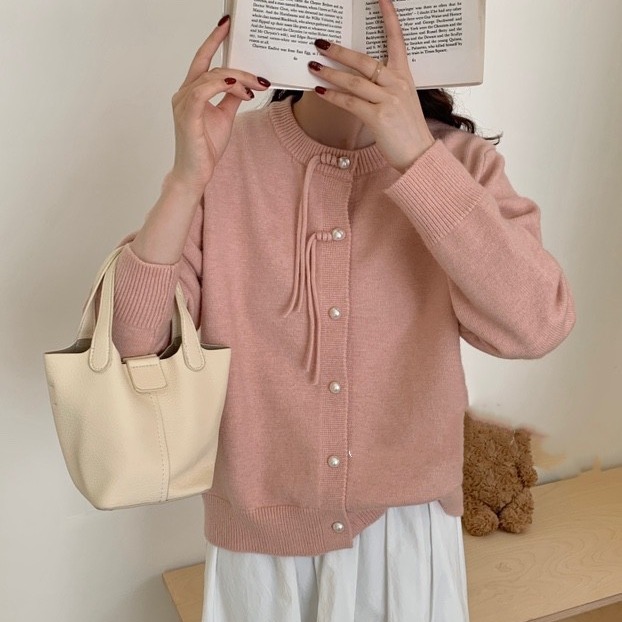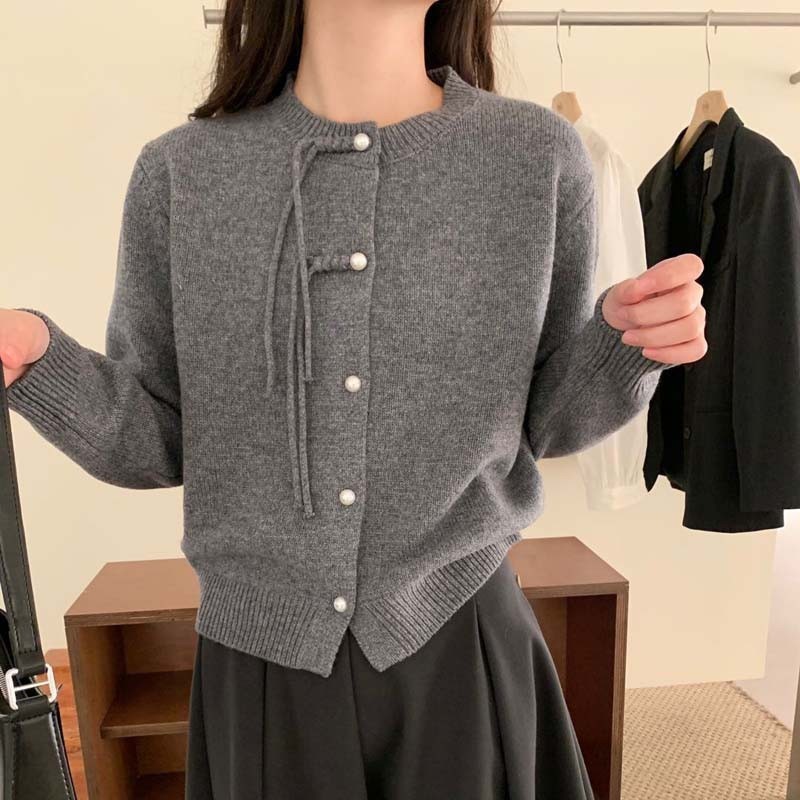Korean style spring round neck knitted cardigan women’s long sleeve pearl buckle tassel elegant soft glutinous gentle retro sweater coat