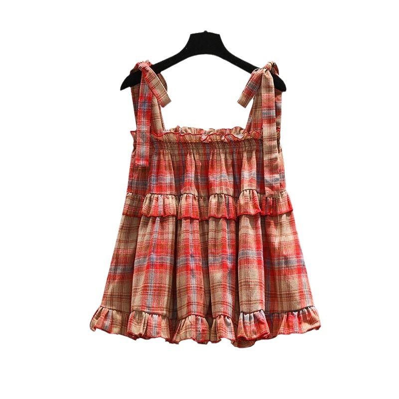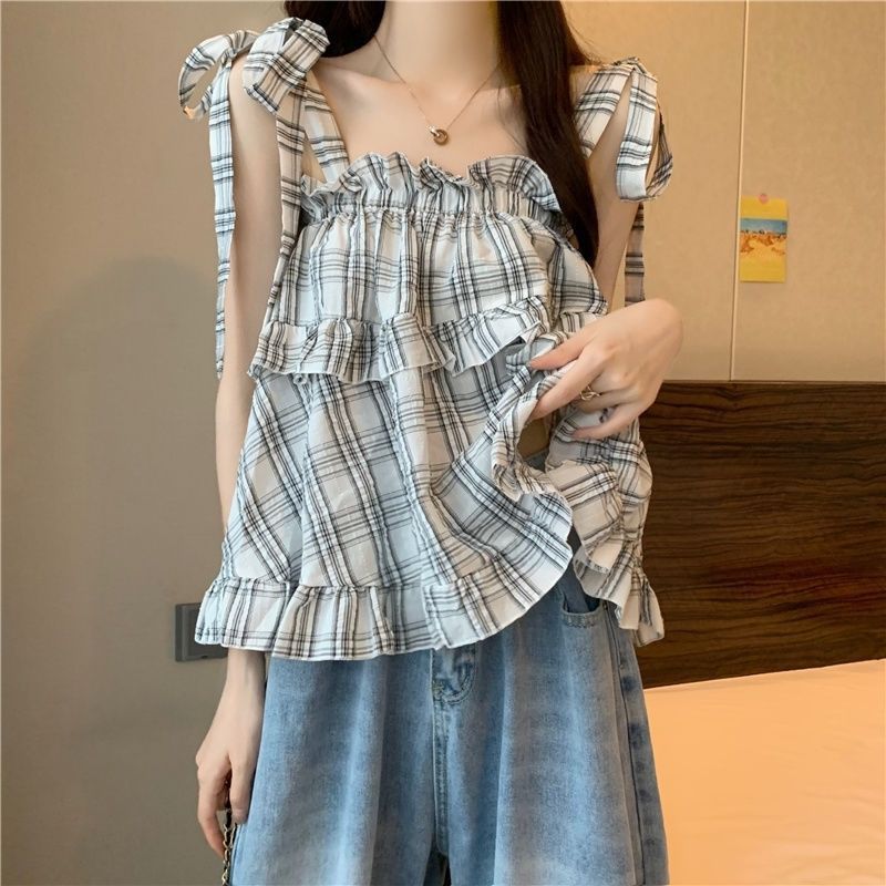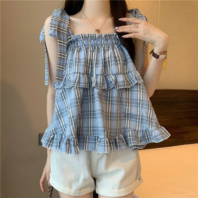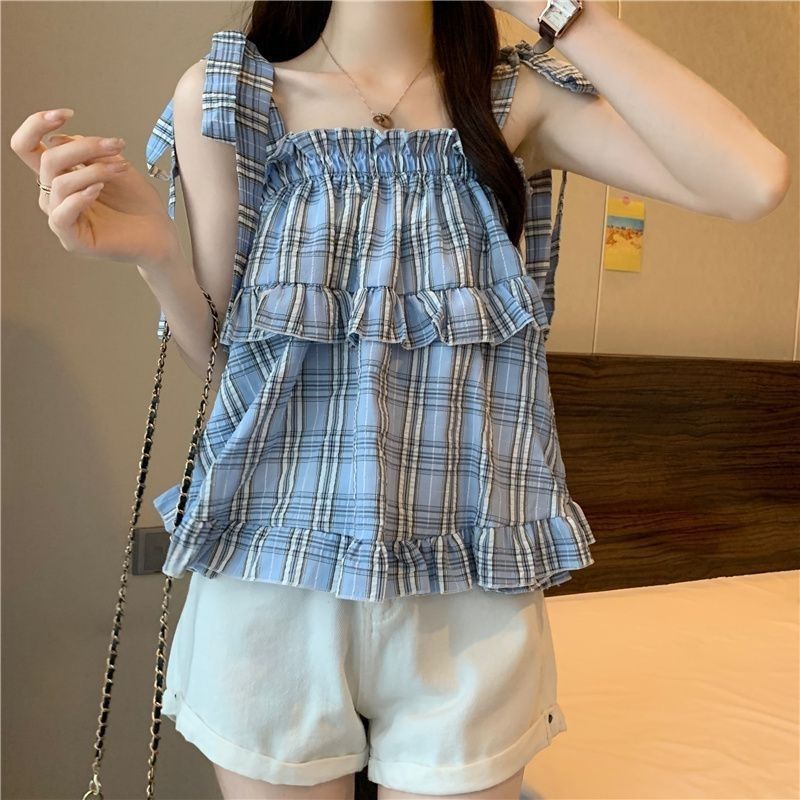 Korean Style Strap Loose Plaid Sling Women’s Outer Wear Summer Sweet Age-reducing Ruffled Sleeveless Shirt Vest Top