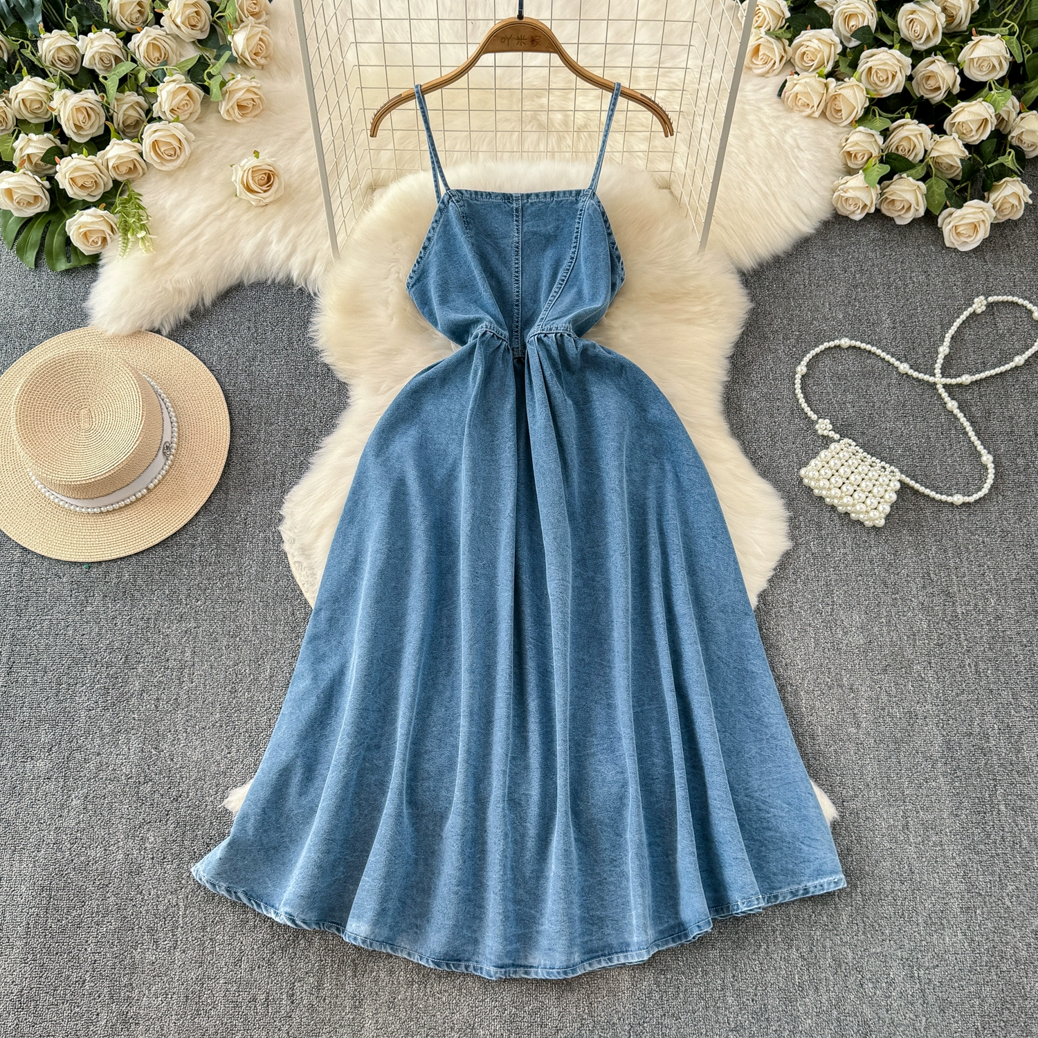 | nameOriginal | Korean style summer retro A-line suspender denim dress |