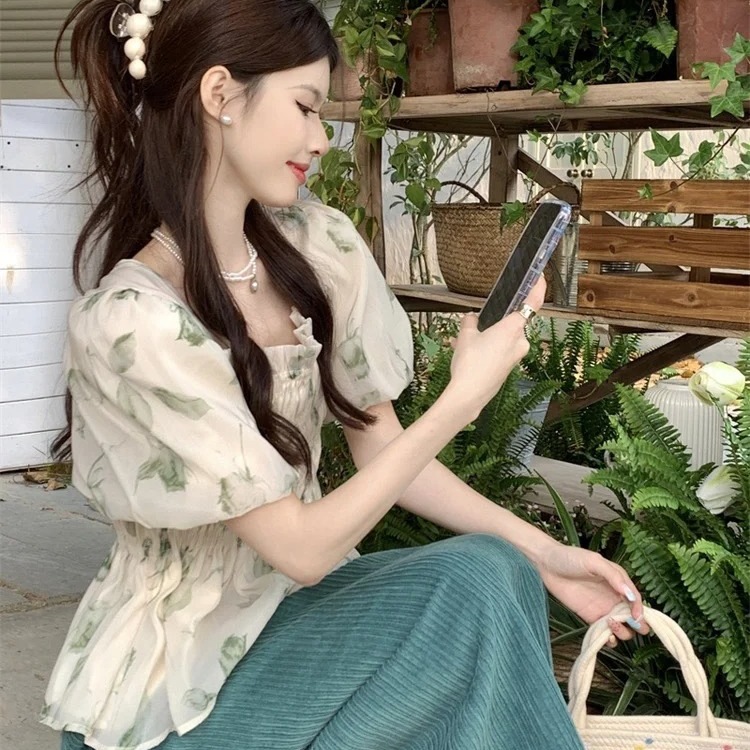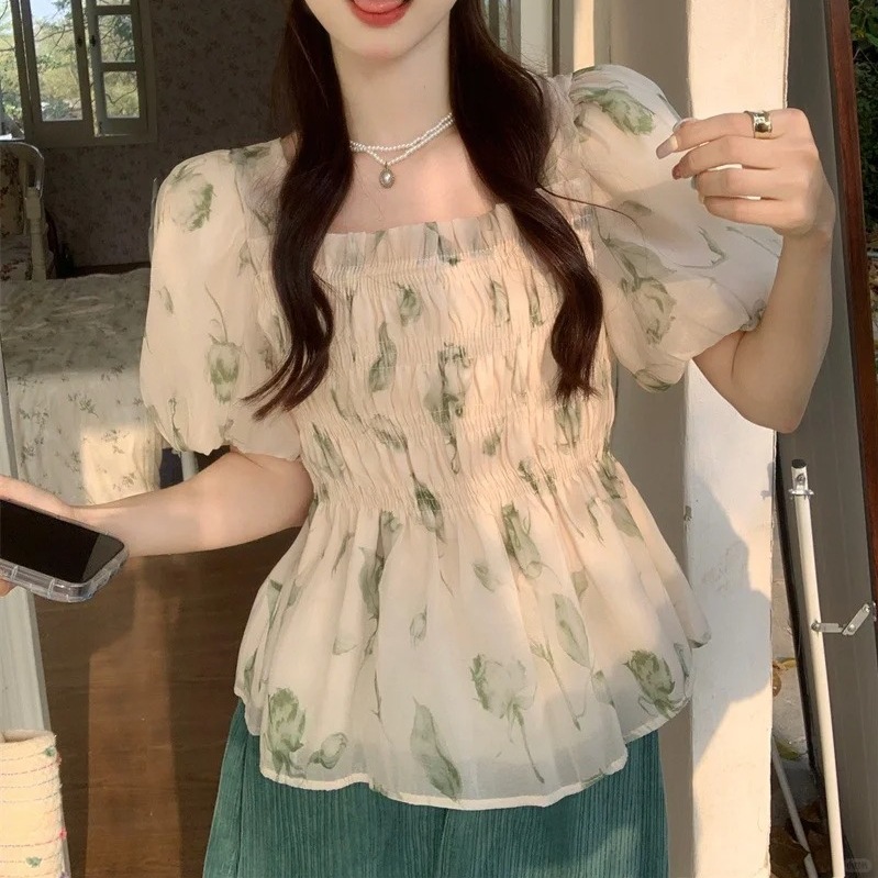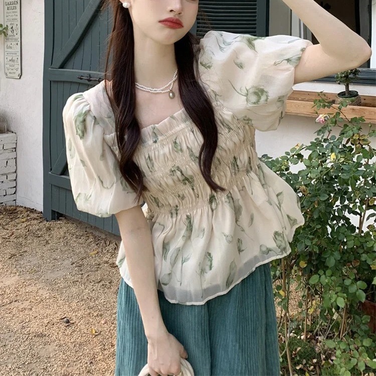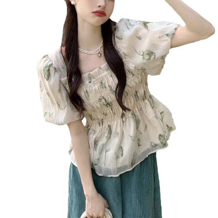 | nameOriginal | Korean Style Sweet Floral Chiffon Top Summer Loose Square Collar Puff Sleeve Design Niche Sunscreen Shirt for Women |