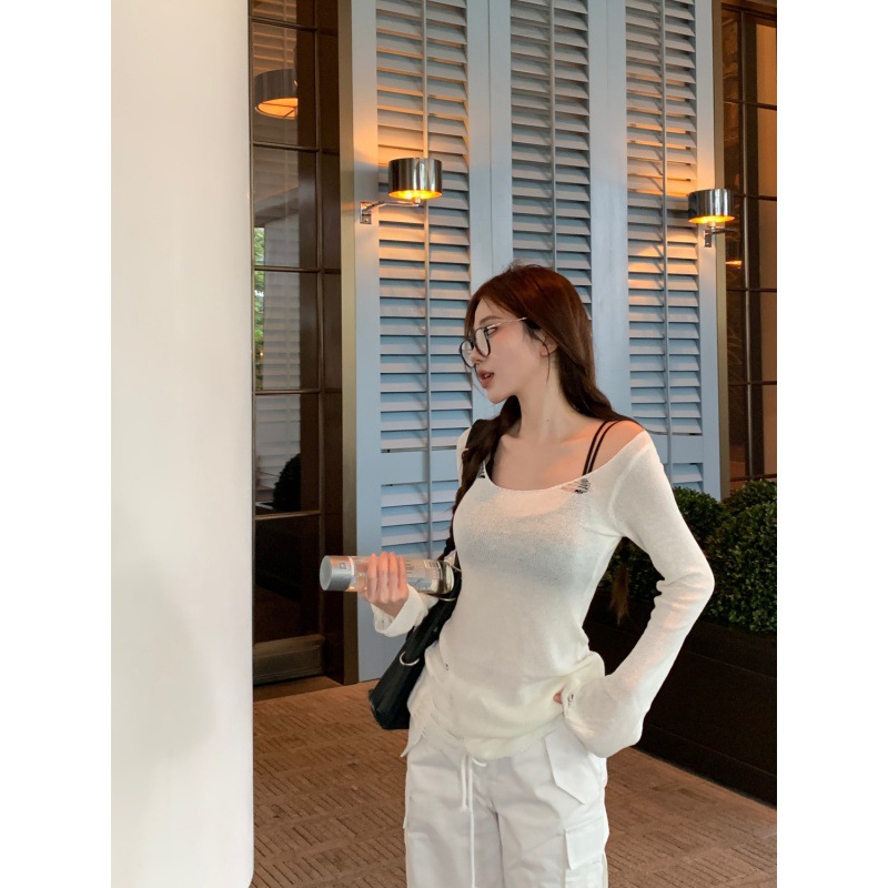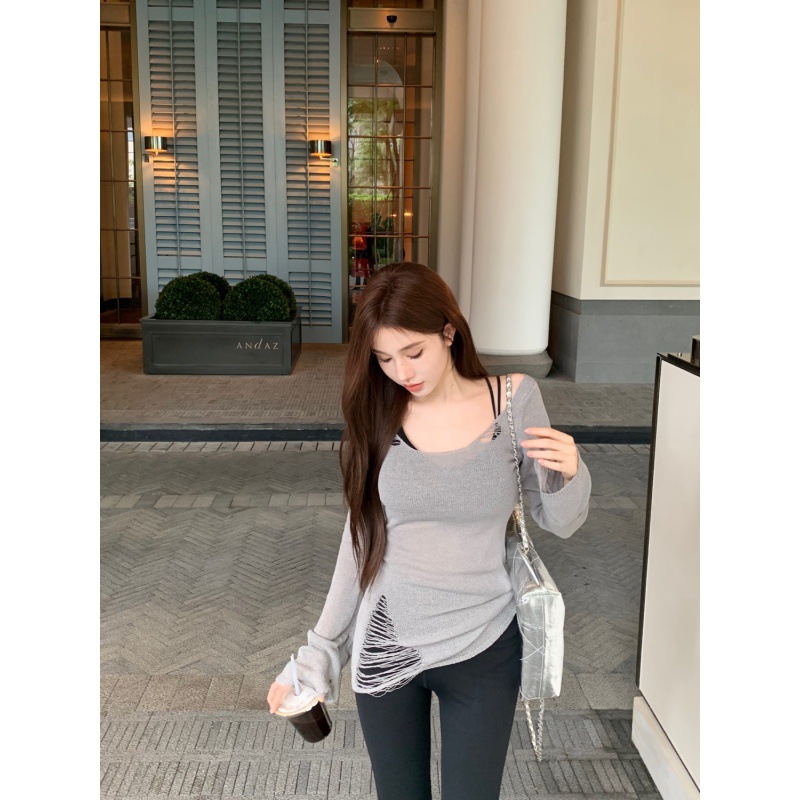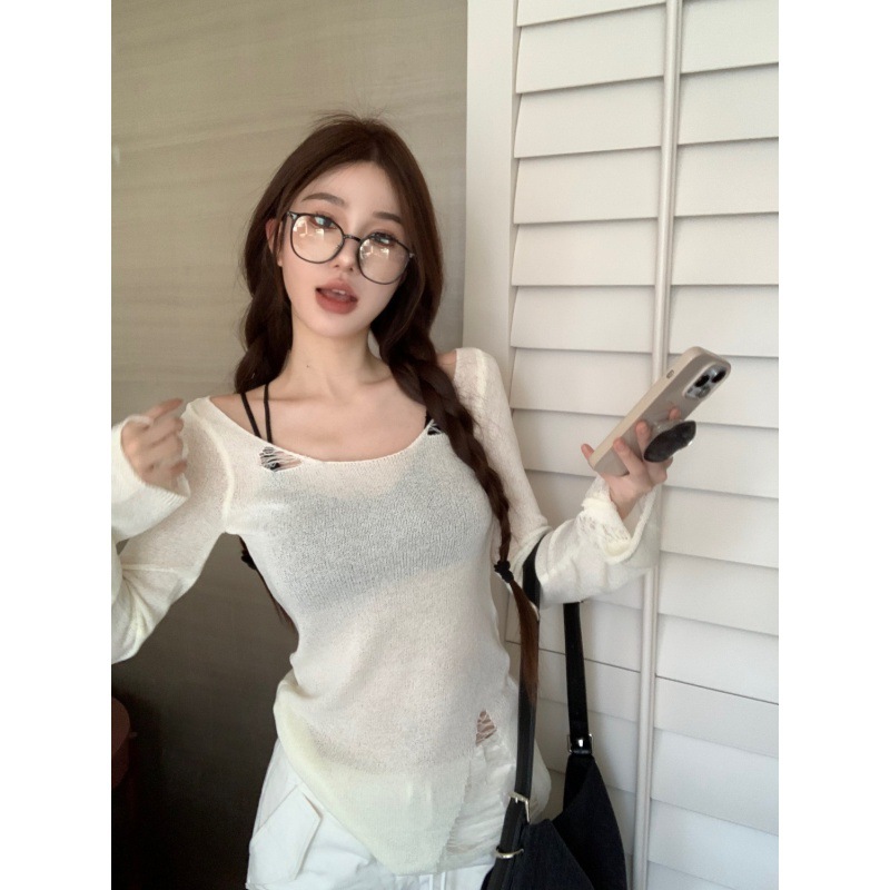 | nameOriginal | Korean Style Sweet Long-sleeved Ripped Knitted T-shirt Women's Summer Thin Sunscreen Blouse Slim-fit Unique Chic Top |