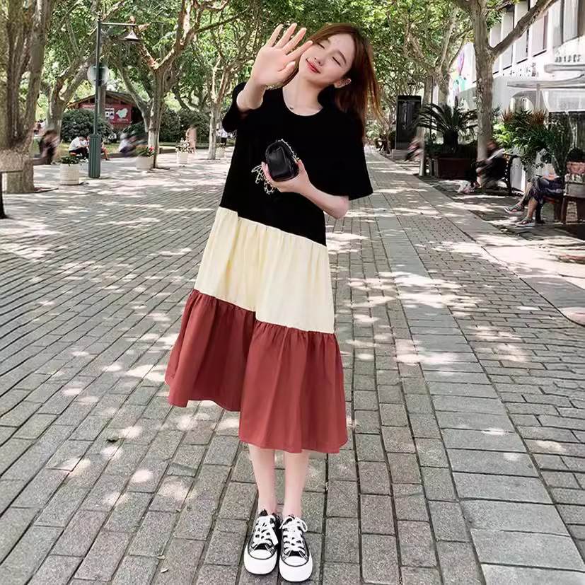 | nameOriginal | Korean style T-shirt dress stitching contrast color female student loose plus size fashionable western style mid-length over-the-knee skirt summer |