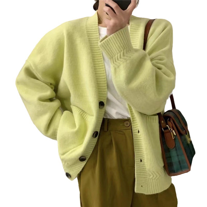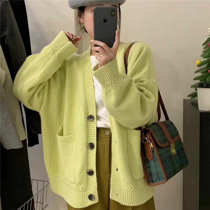 Korean style V-neck pocket knitted cardigan 2023 autumn and winter New loose lazy soft glutinous design sweater coat for women