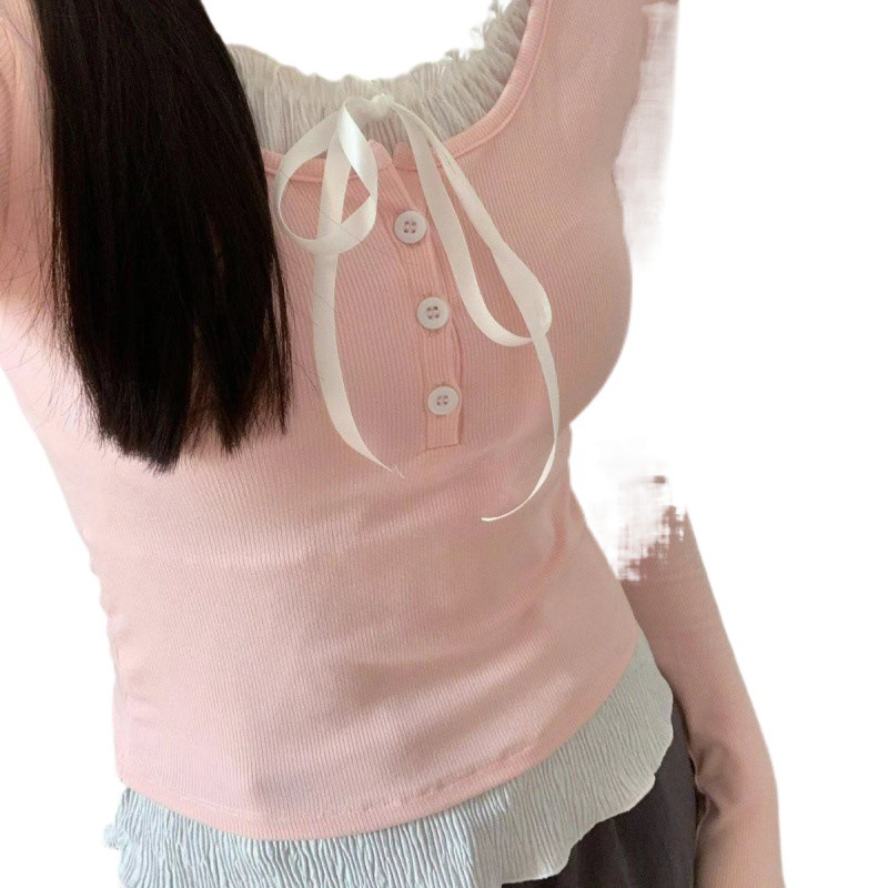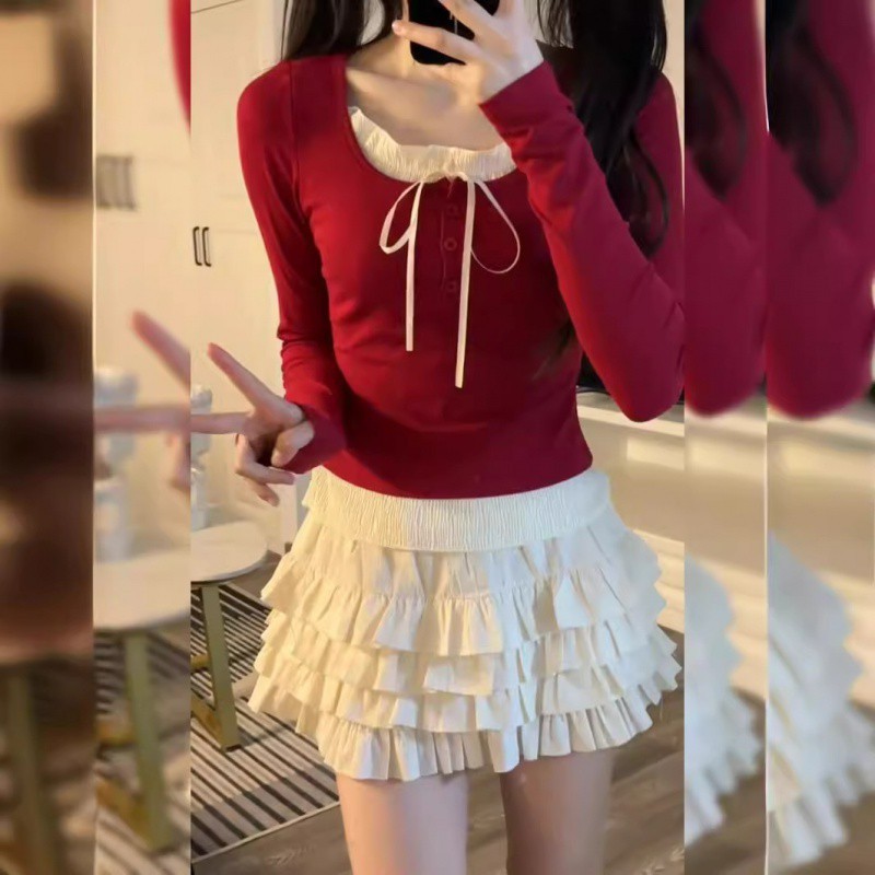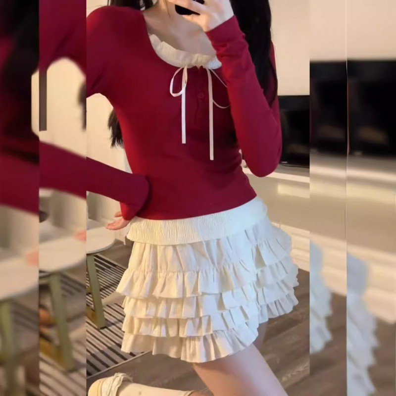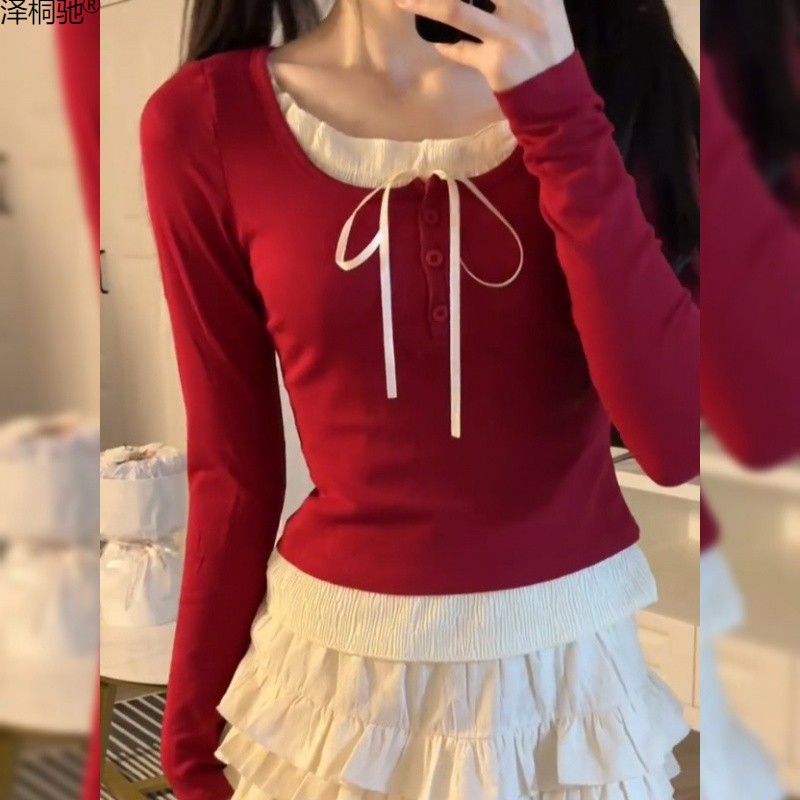 | nameOriginal | Korean Style Wine Red Fake Two-piece Stitching Long-sleeved Shirt Women's Spring and Autumn Bow Inner Chic Slim-fit Bottoming Top |