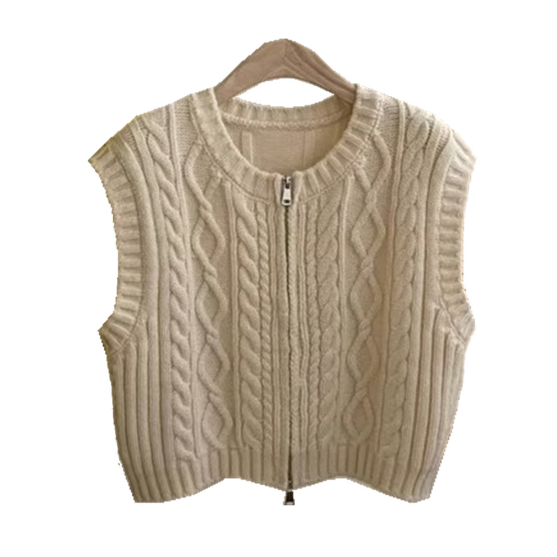 Korean style women’s autumn vintage twist double zipper knitted vest women’s loose stacked round neck sweater waistcoat