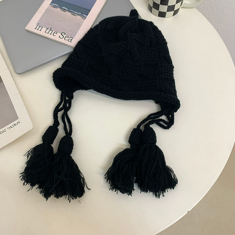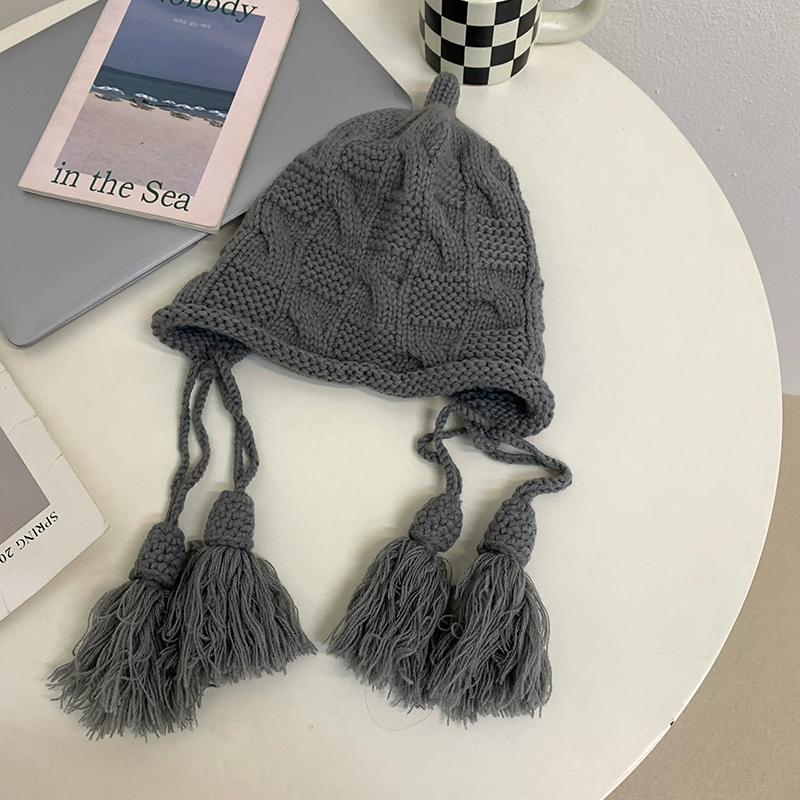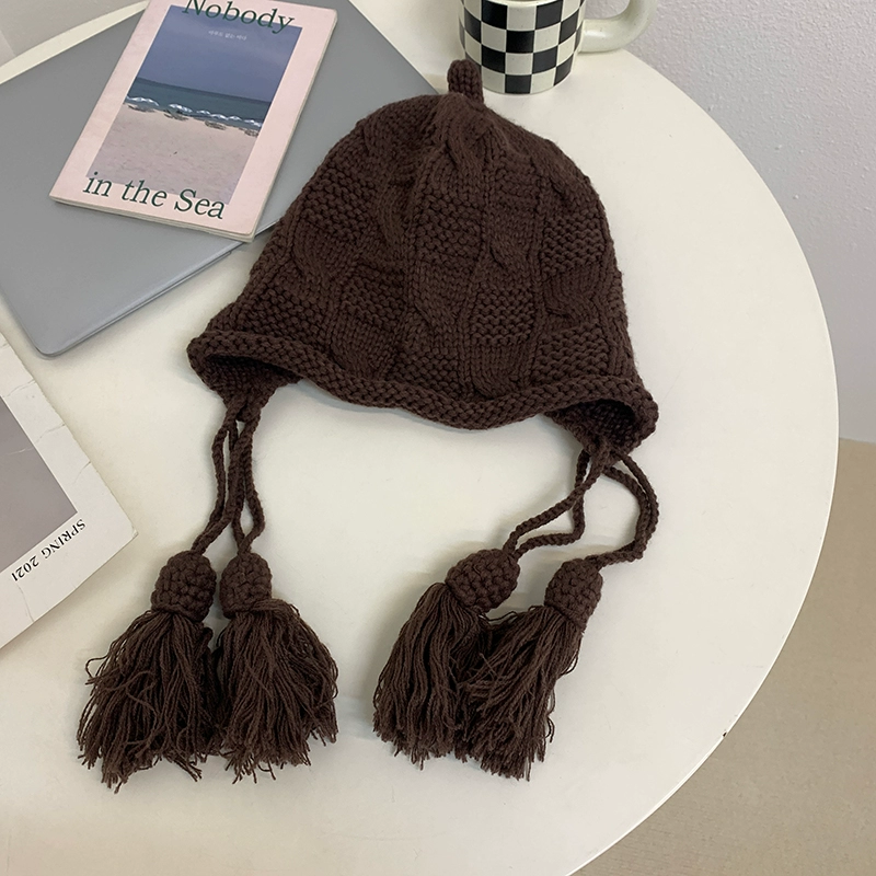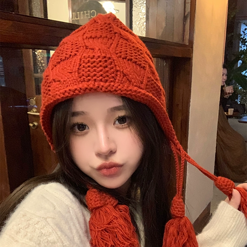 Korean version ins red woolen hat for women in autumn and winter hand-knitted tassel pullover hat winter warm ear protection hat