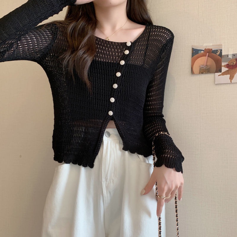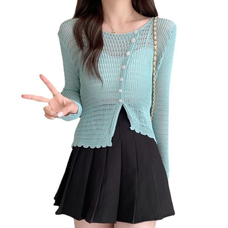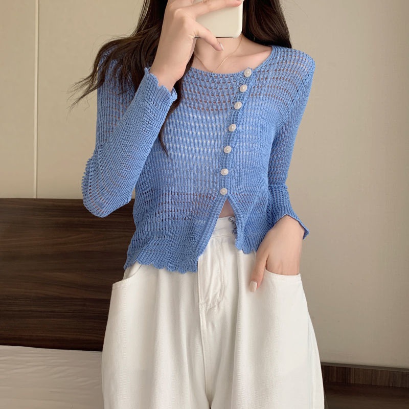 | nameOriginal | Korean version of the gentle wind air conditioning shirt summer new hollow design sense thin sunscreen long sleeve knitted top women. |