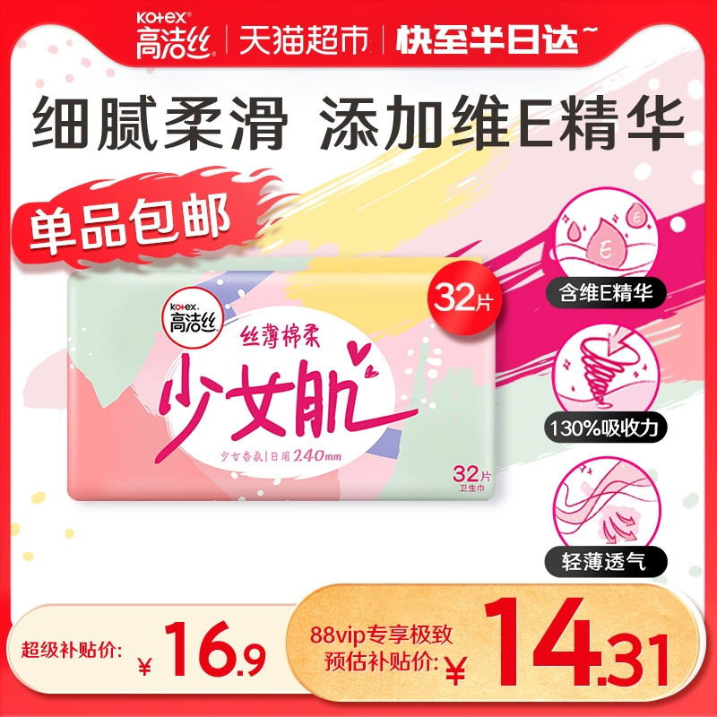 | nameOriginal | Kotex 32 pieces daily use for girly skin 240mm 32 pieces cotton soft breathable sanitary napkins with added vitamin E essence sanitary napkins |