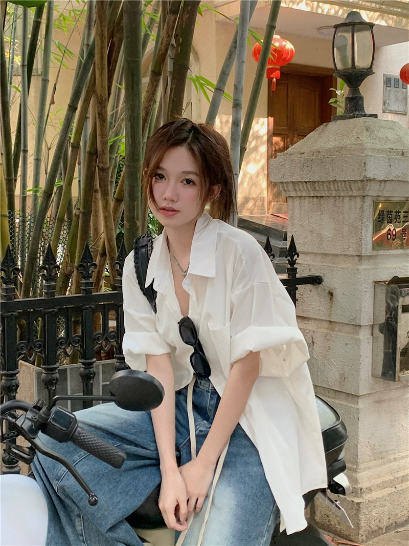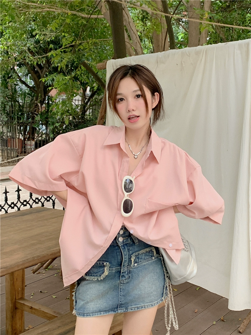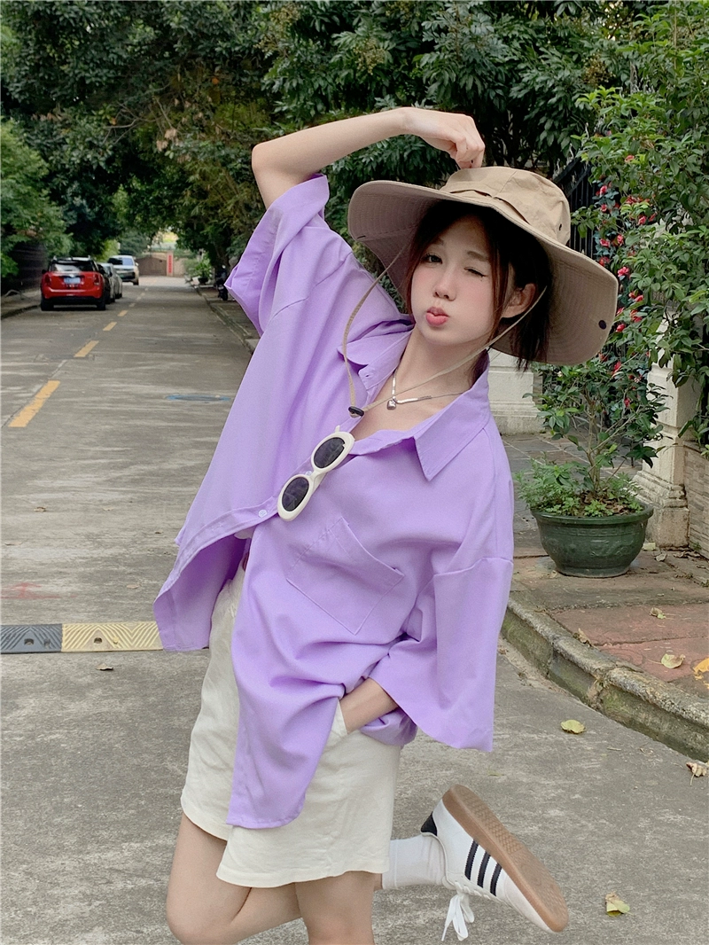 kumikumi blue loose mid-length short-sleeved shirt