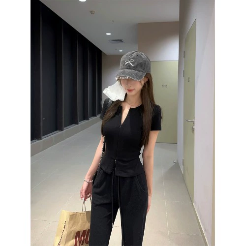 kumikumi design double zipper short-sleeved T-shirt women’s summer niche slim chic chic short top