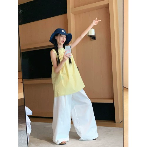 | nameOriginal | kumikumi pleated yellow sleeveless floor-length pants vest |