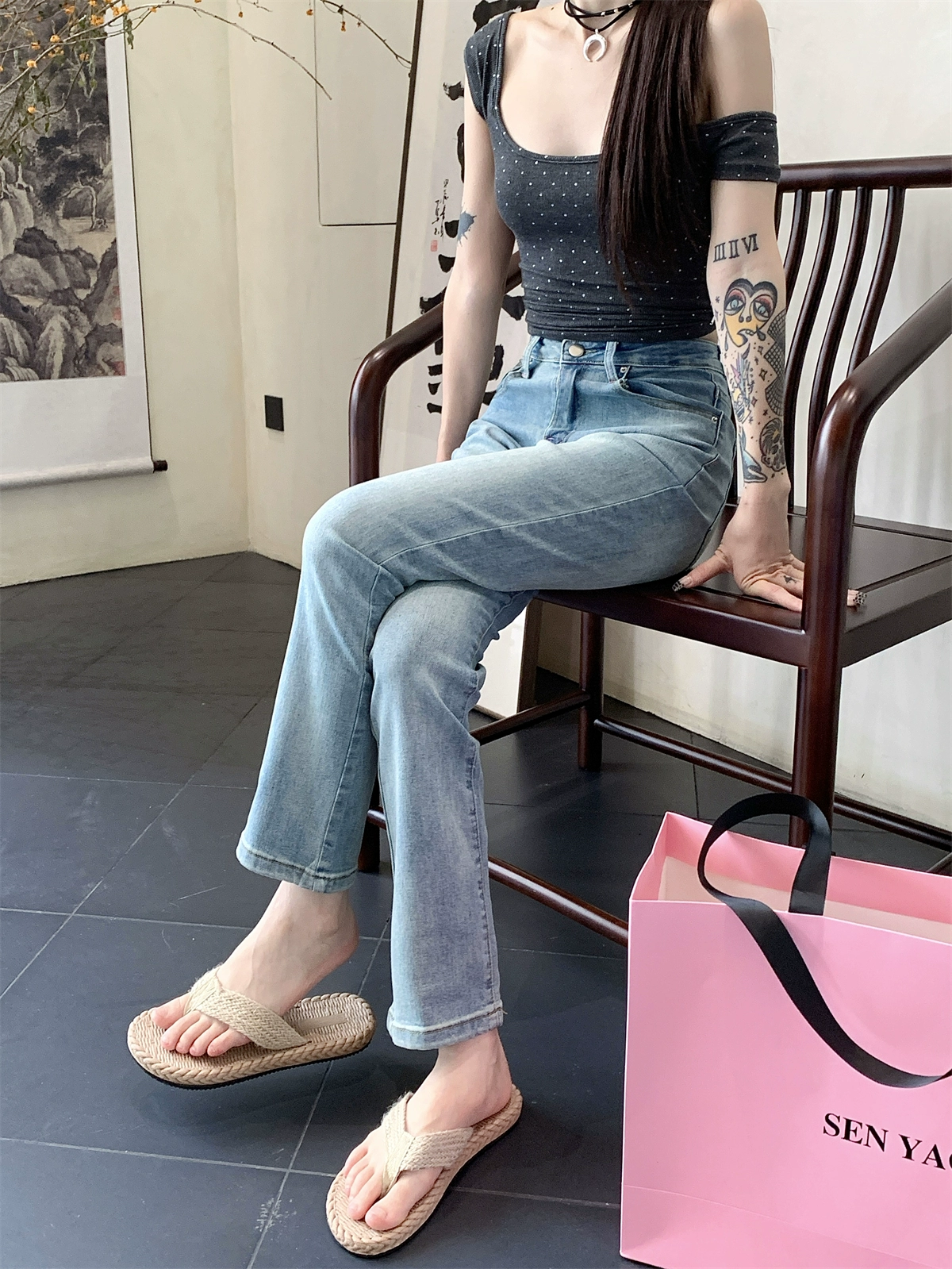 kumikumi washed distressed high waist slim fit jeans