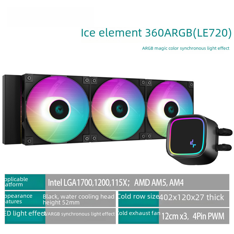 | nameOriginal | Kyushu Fengshen LE720 ice element 360 integrated water-cooled CPU radiator ARGB 1700/AM5 platform |