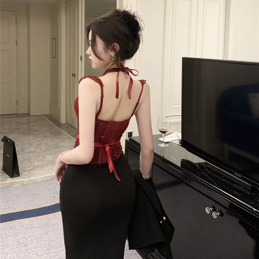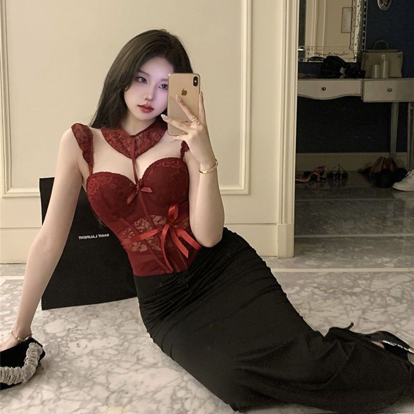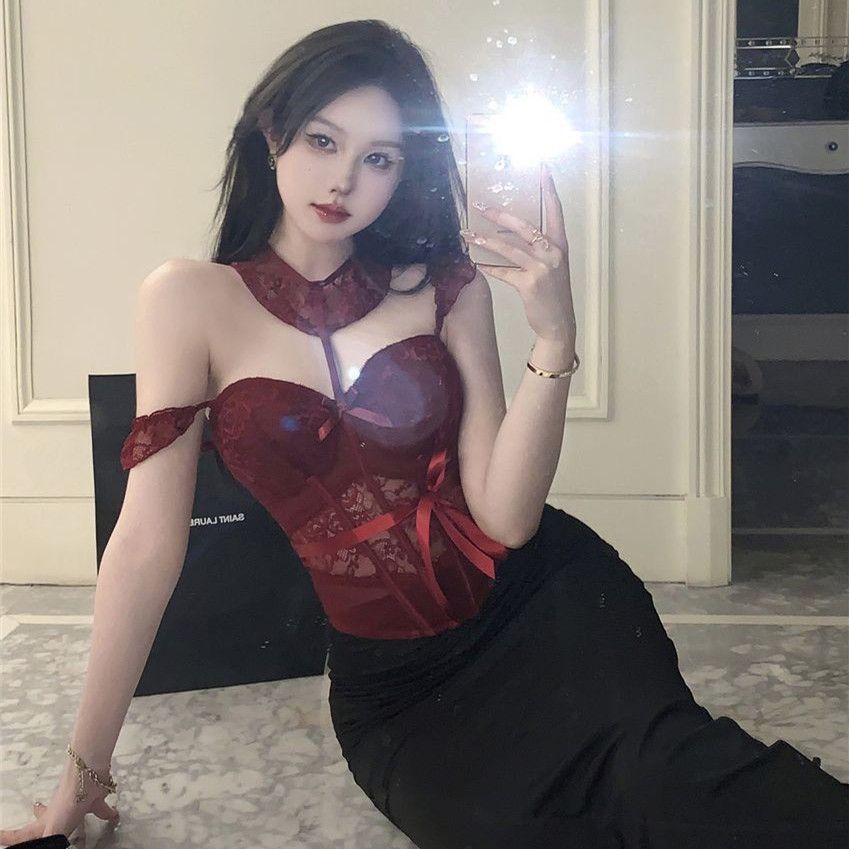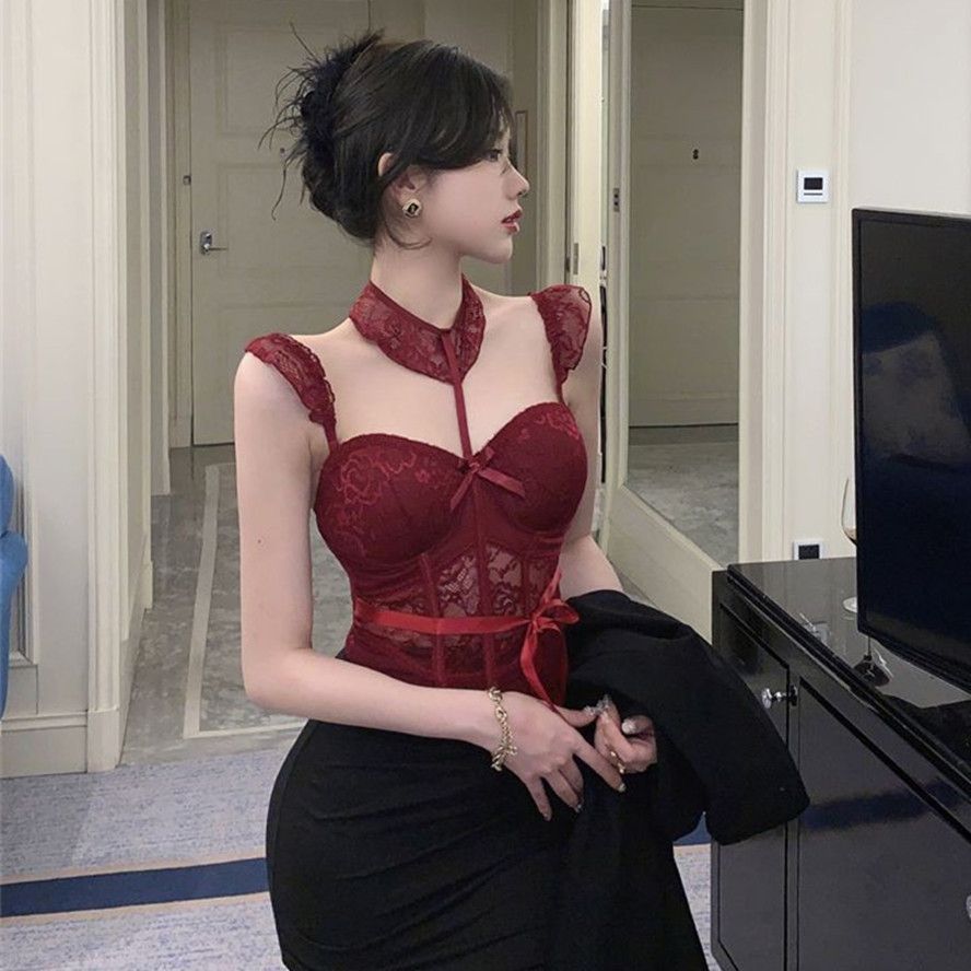 | nameOriginal | Lace Camisole Women's Inner Base Sexy Spice Girl Lace Fishbone Mesh Exposure Back French Outer Wear Top |