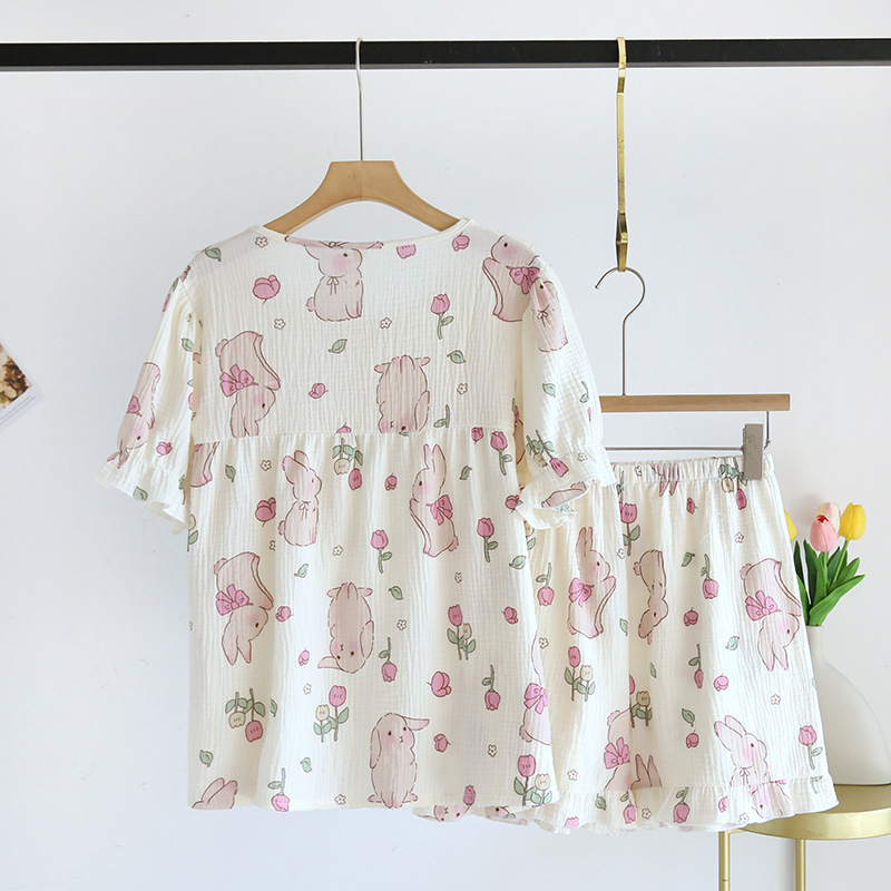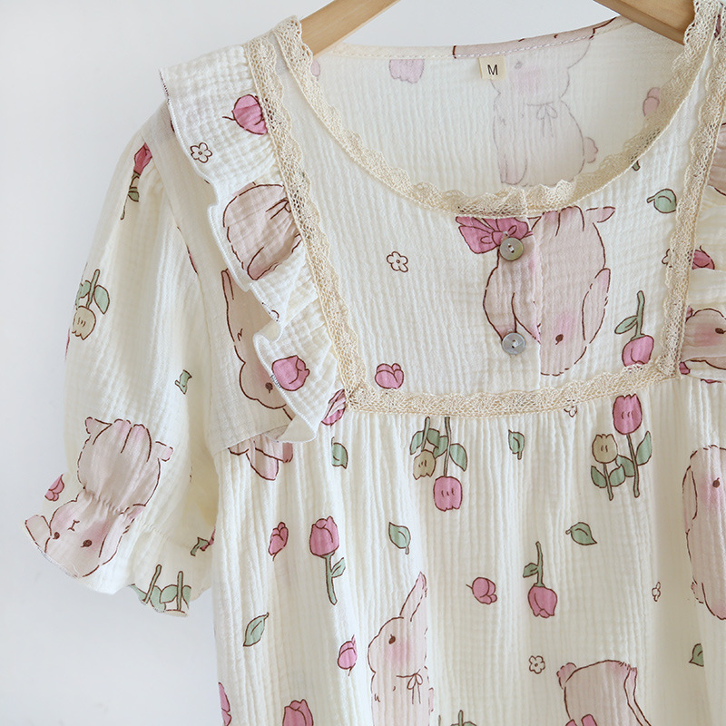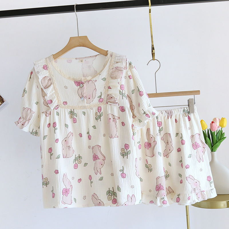 Lace Crepe Cotton Women's Short-sleeved Shorts Pajamas Set Tulip Rabbit Pullover Outfit Home Clothes