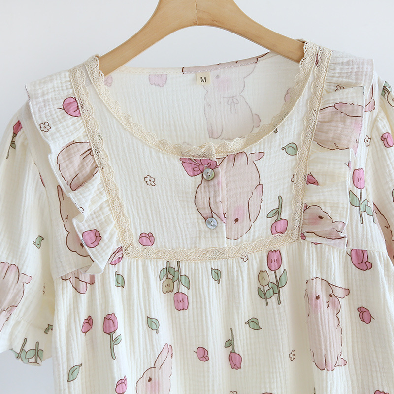 Lace Crepe Cotton Women’s Short-sleeved Shorts Pajamas Set Tulip Rabbit Pullover Outfit Home Clothes
