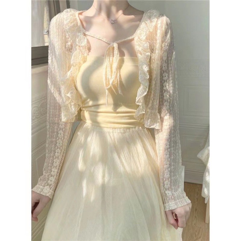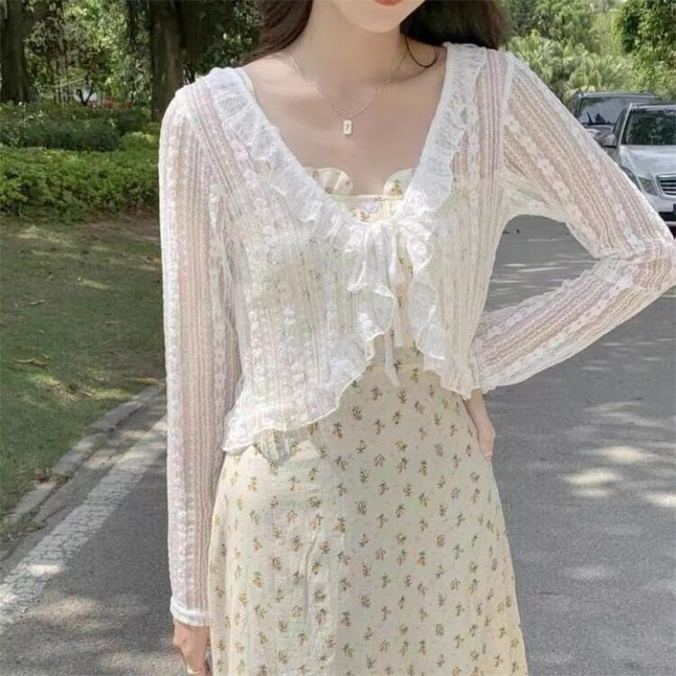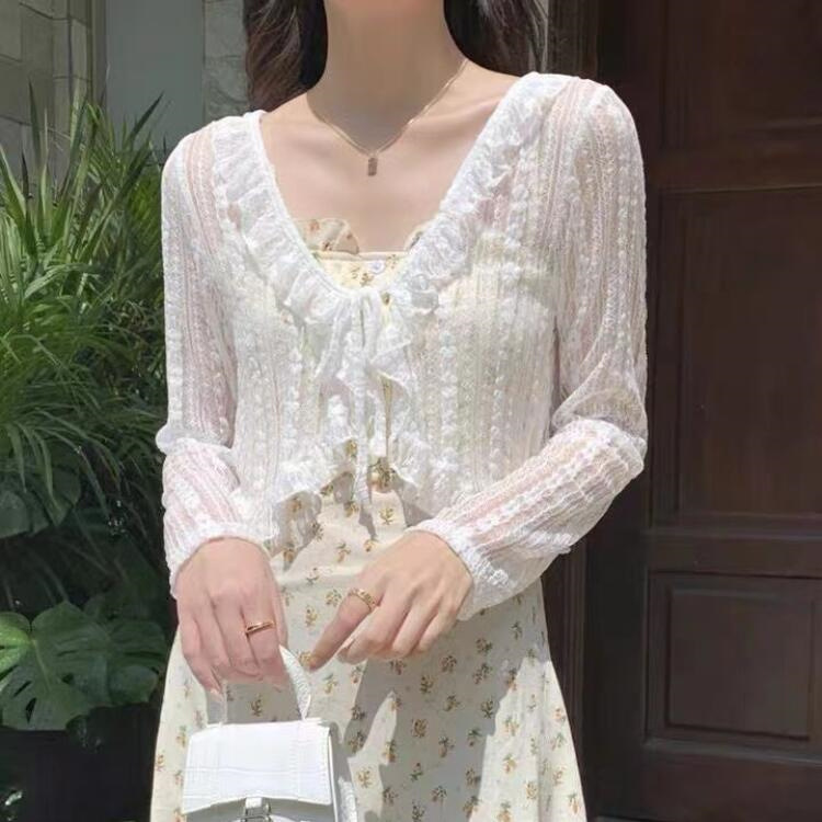 Lace Lace-Up Cardigan Lace Collar Sunscreen Air-conditioning Shirt Shawl Thin 2024 Summer Chiffon Gentle Fairy Style V-Neck