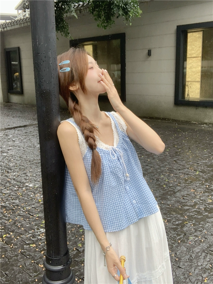 | nameOriginal | Lace patchwork sleeveless loose shirt top with suspenders |