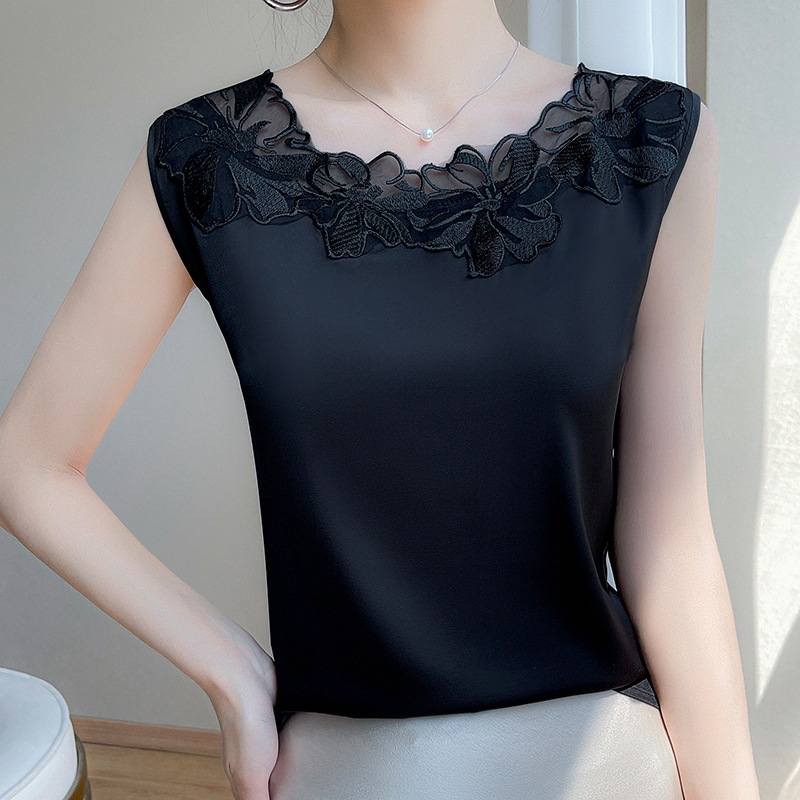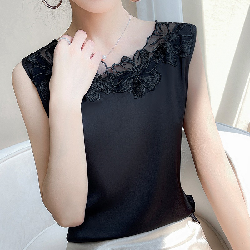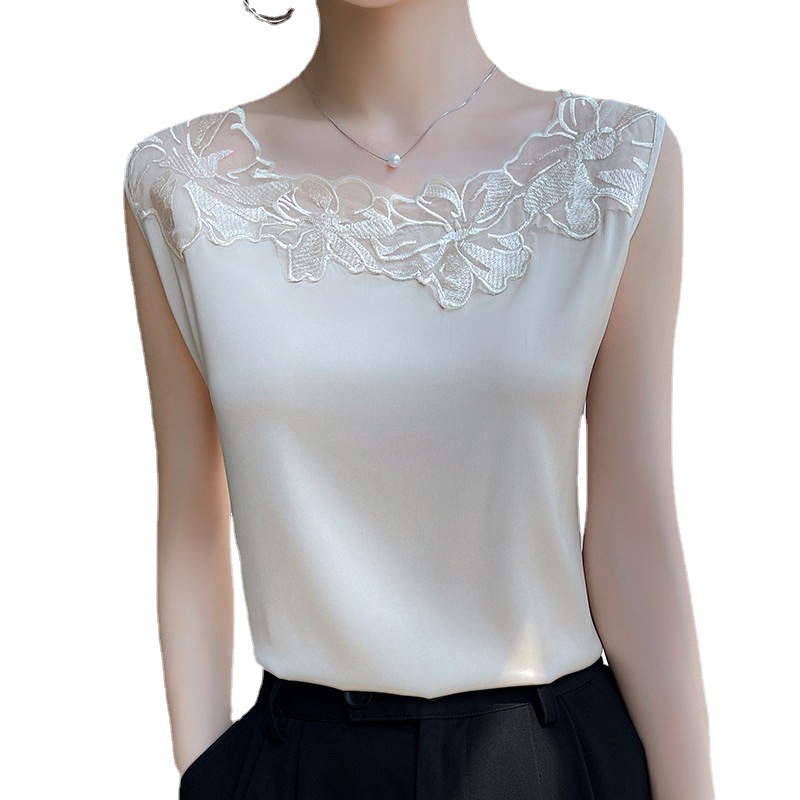 Lace round neck satin camisole 2024 Summer outer wear plus size satin bottoming shirt suit inner sleeveless top