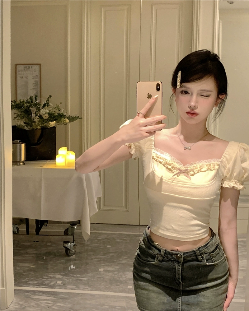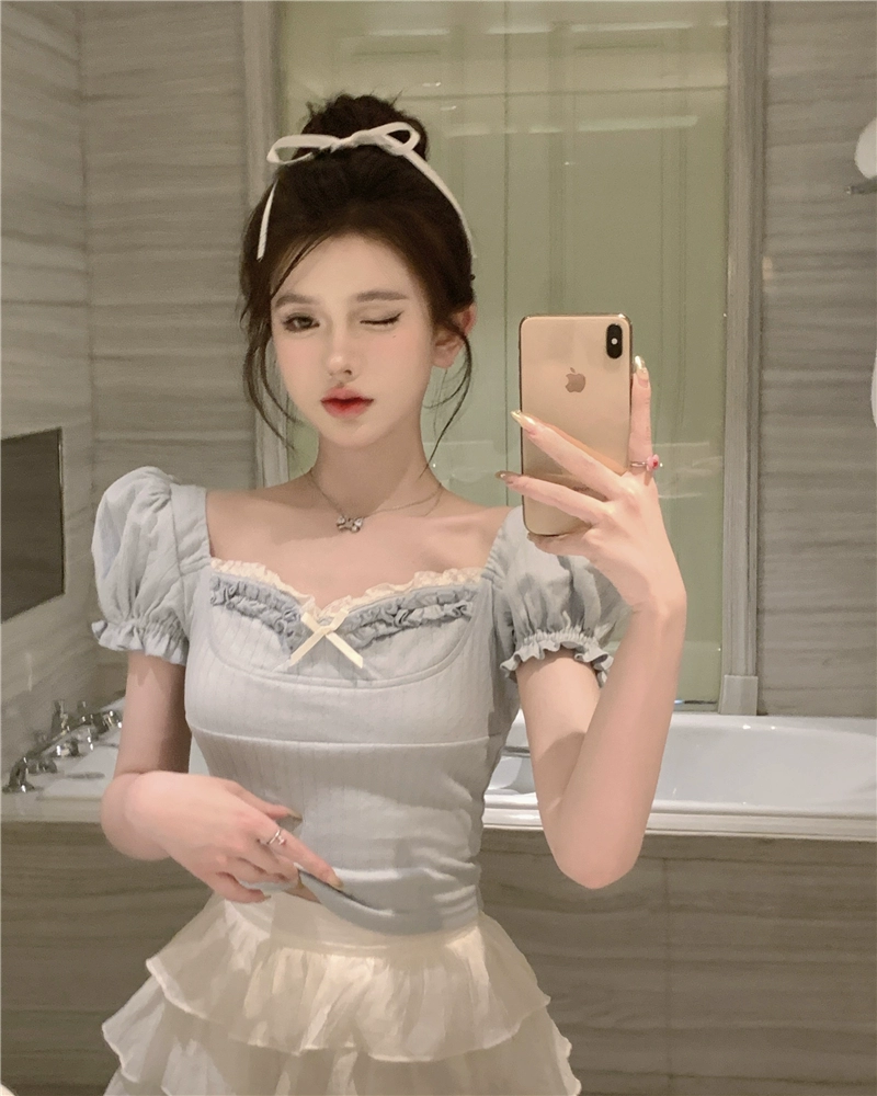 Lace short-sleeved T-shirt summer slim top with bow