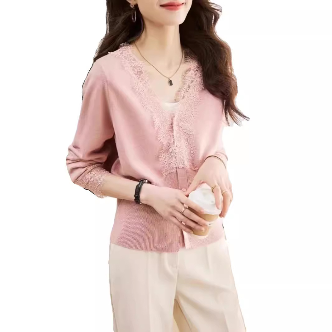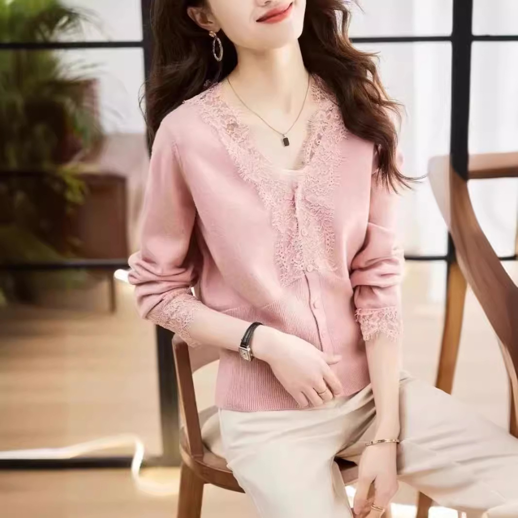 Lace Stitching Knitted Cardigan Women’s 2024 Autumn New Retro Elegant Elegant Slim V-Neck Base Top